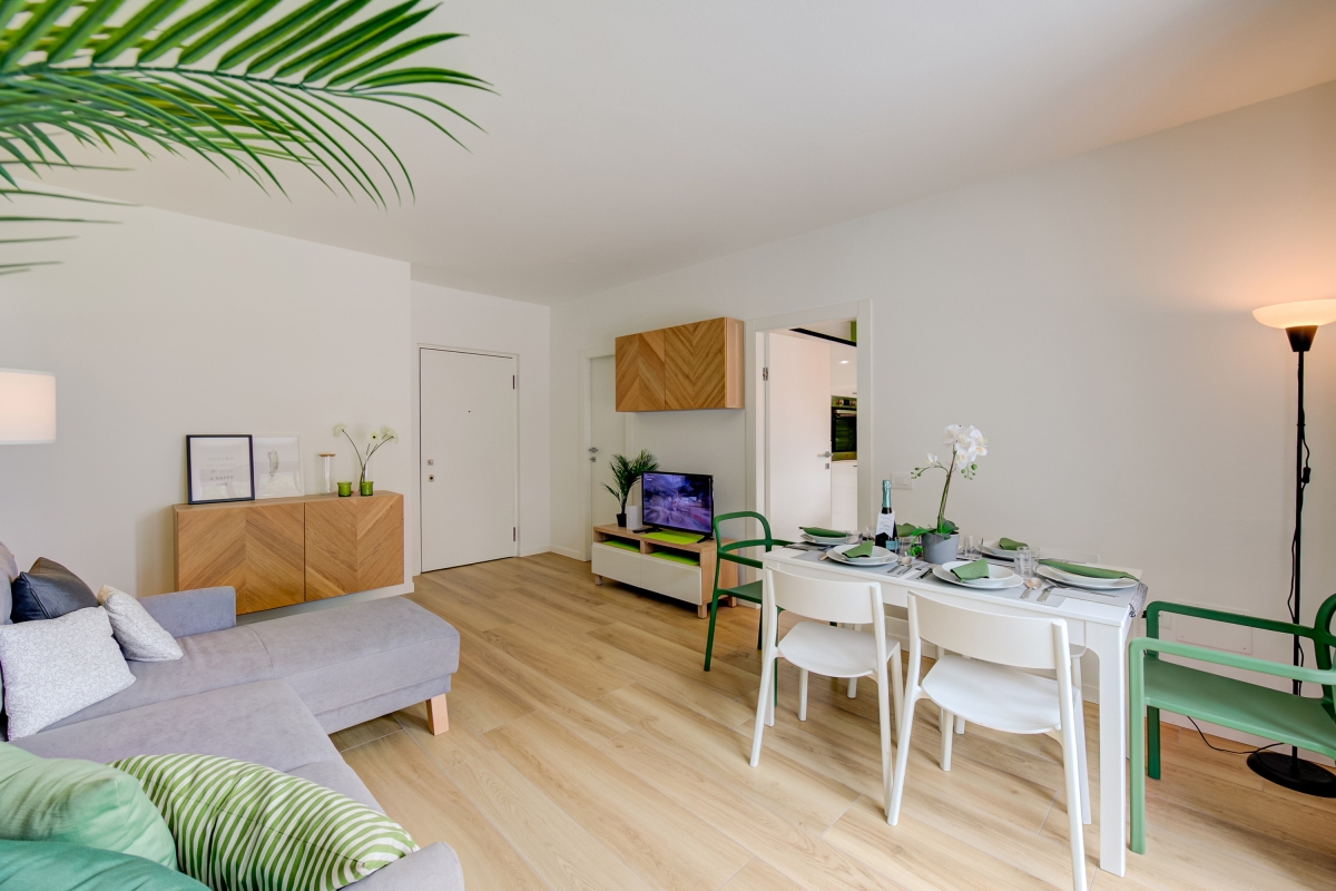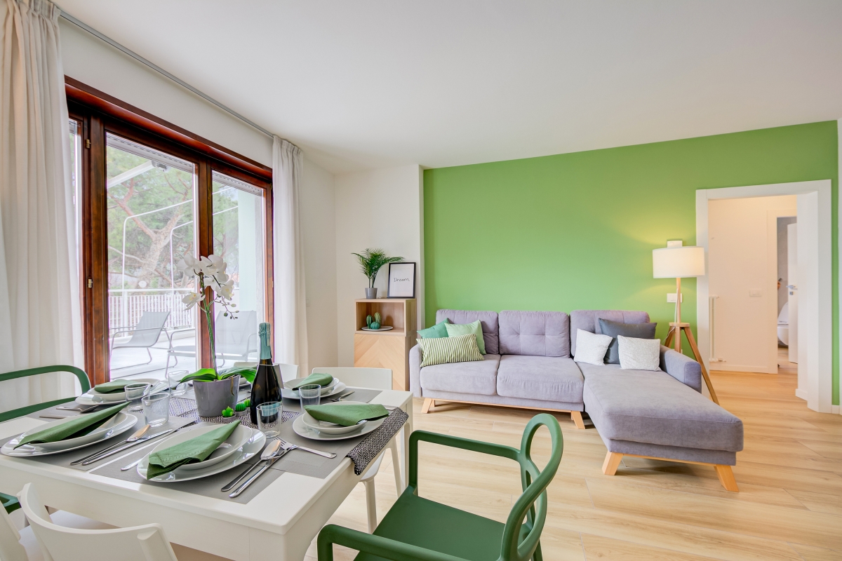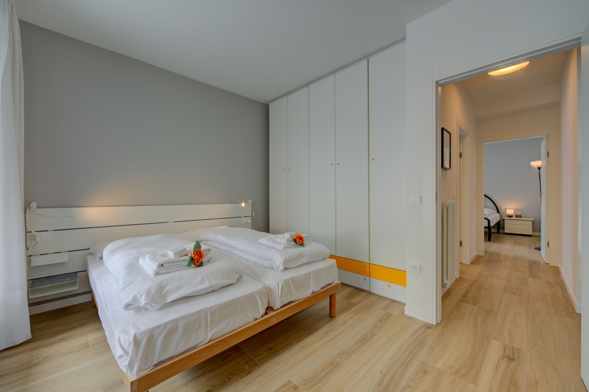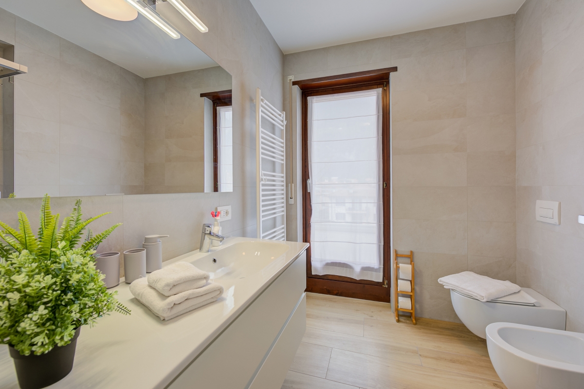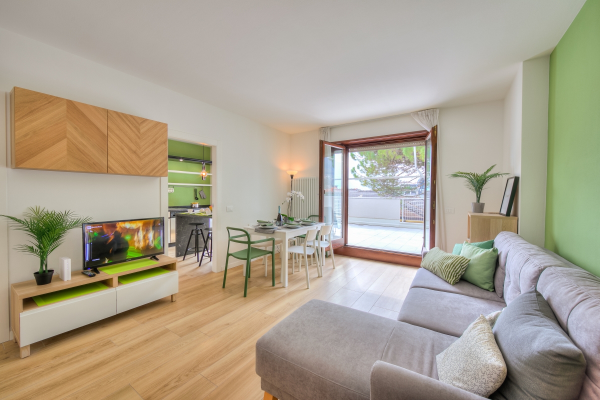 Perfect for vacations with your family and furry friends and located just a 10-minute walk from the centre of Riva del Garda, this 2-bedroom holiday rental for 6 is the ideal choice for those who want to unwind in a blissful environment and also enjoy proximity to the happening historic centre of Riva. The third-floor apartment offers convenient lift access and a private terrace with open-air dining as well as sun loungers. Inside, this stylish retreat welcomes you in a spacious and airy living room with a large L-shaped sofa with direct terrace access and a fully-equipped kitchen with dining for carefree self-catered stays. Essential kitchen appliances include an induction hob, Moka coffee machine, oven, fridge with freezer, food processor and dishwasher.