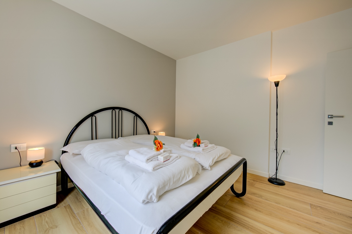 Bedroom 1: A modern and bright master bedroom with a double bed, terrace access and wardrobe.