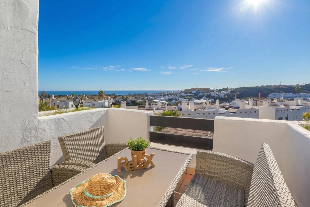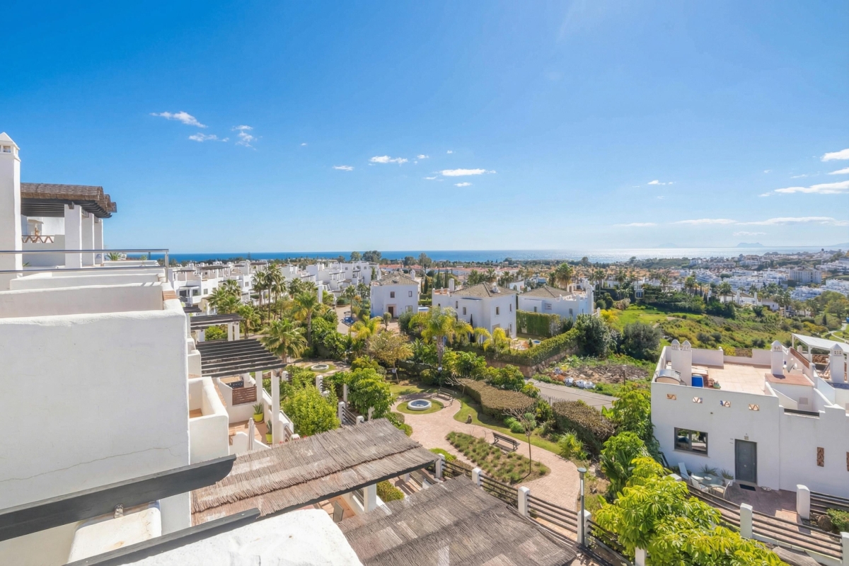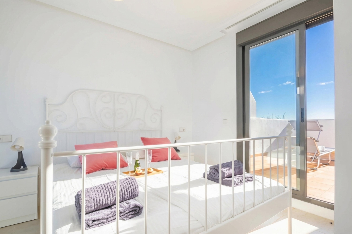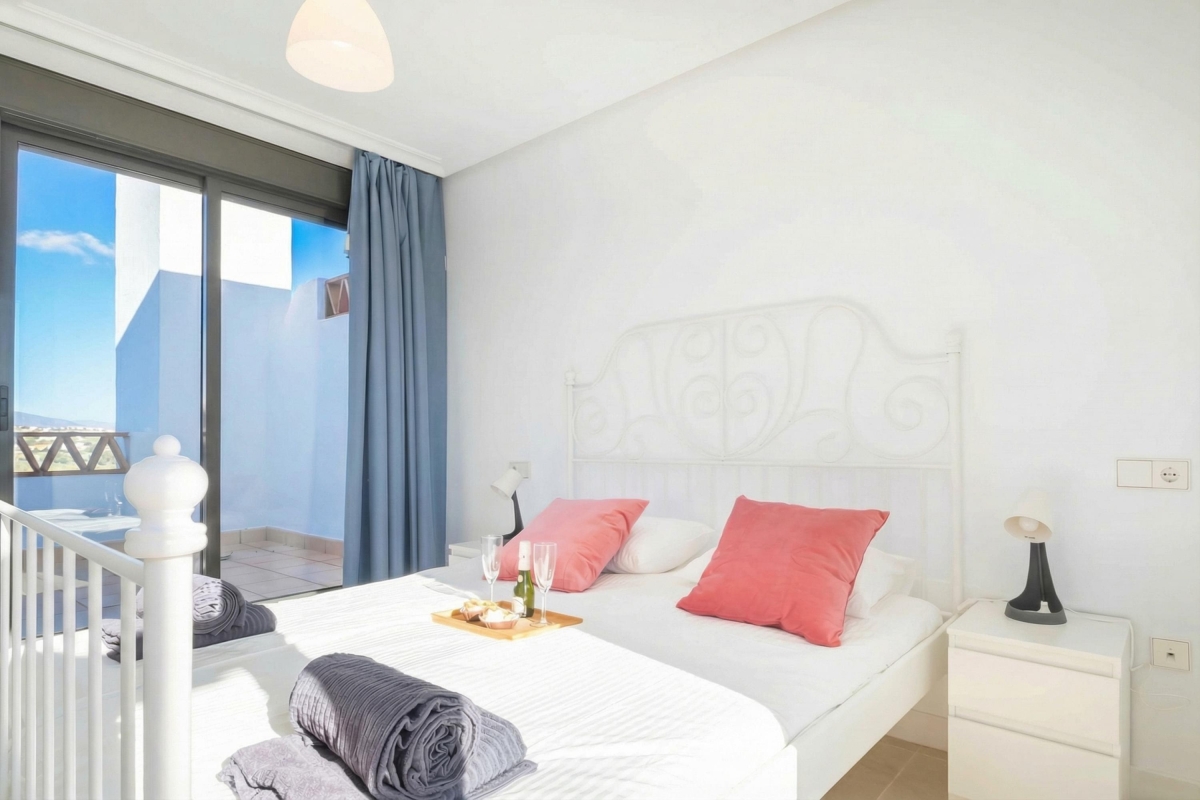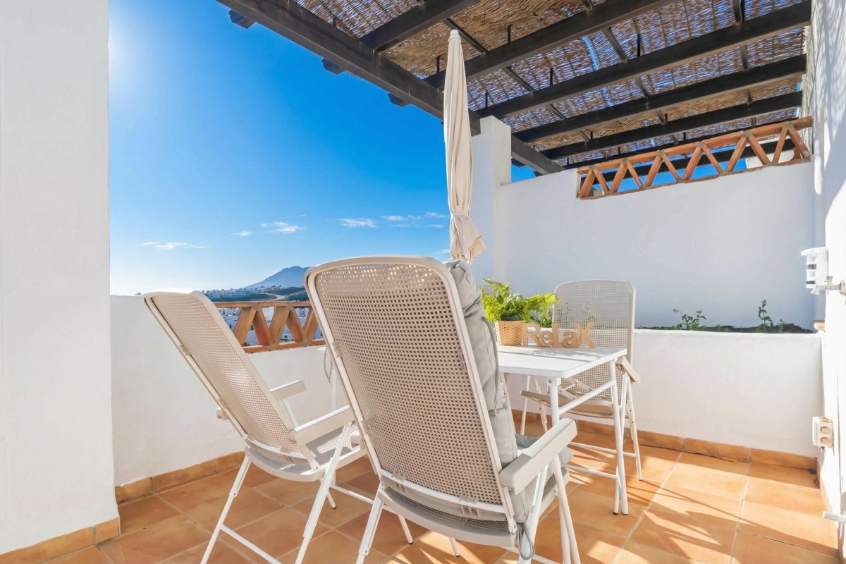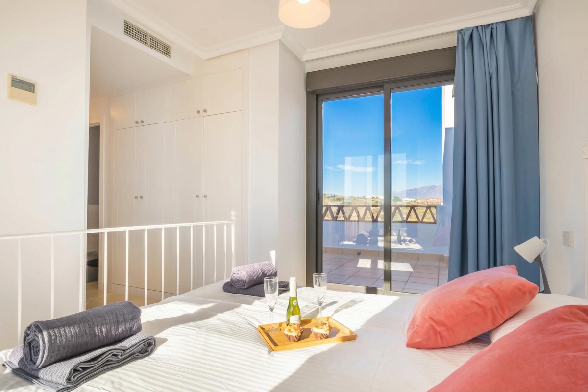 Located in a modern complex with a shared pool and garden, this 2-bedroom apartment in two floors is a delightfully peaceful and flexible retreat accommodating all types of travellers; from golf enthusiasts to honeymooners, relaxation seekers, and remote workers. The apartment includes a private roof terrace with sunbeds and an alfresco setup. Inside, the air-conditioned apartment offers a stylish, light-filled space adapted for entertaining, relaxing, and dining. The living room has a large sofa with a flat-screen TV in front, a dining setup and direct access to the equipped and sunny private terrace. A fully equipped contemporary kitchen with a dishwasher, oven, microwave, coffee machine and fridge, among other utilities.