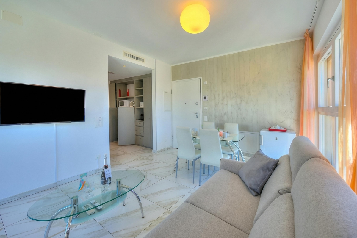 The air-conditioned apartment is located on the sixth floor (with lift access) and offers 2 private balconies, where you can take the first sip of your morning coffee with lovely views. Inside, the apartment features a light and airy living room with a sofa double bed, internet access and a Smart TV. The apartment is suitable for elderly guests.
