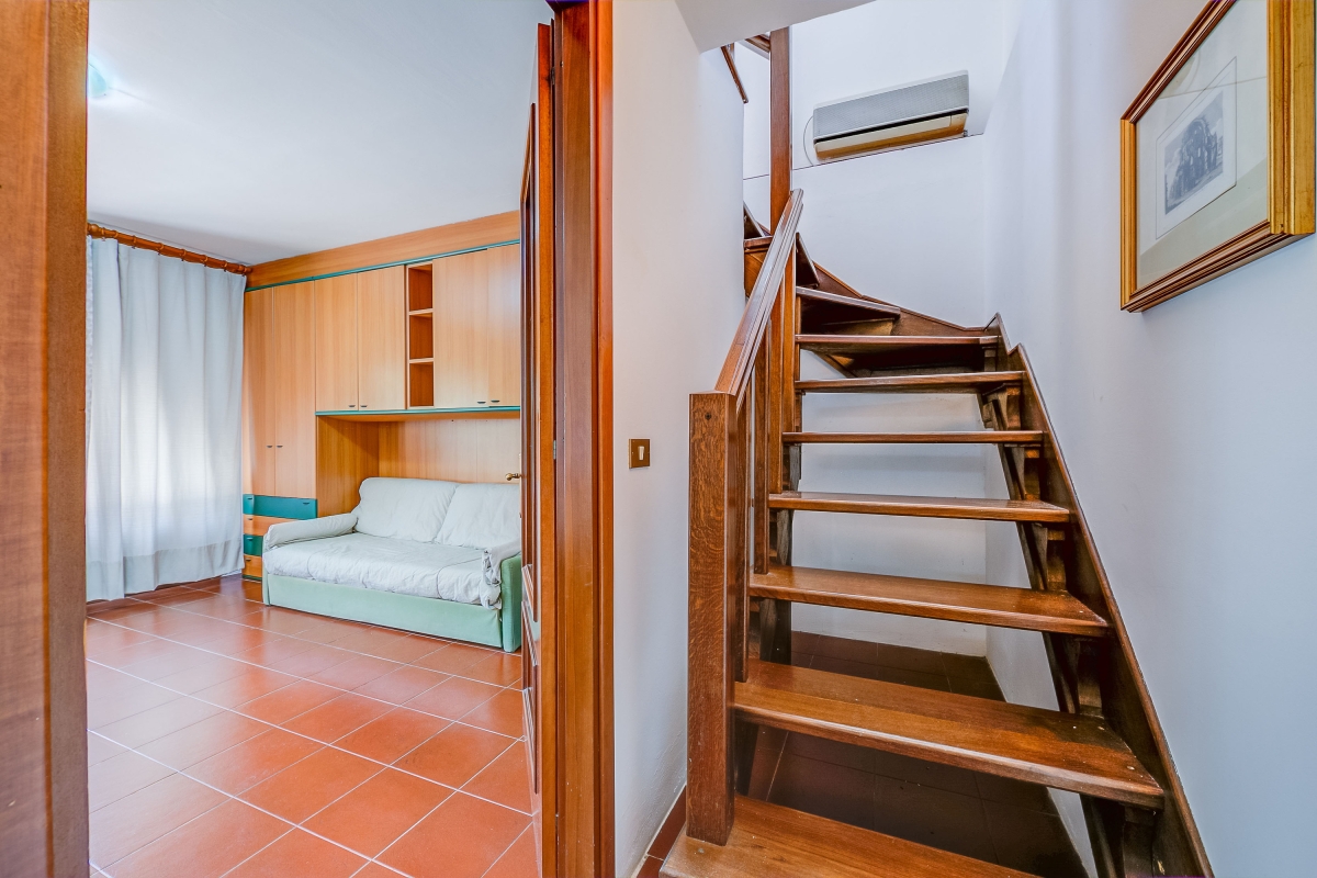 A wooden staircase in the corner of the living room leads down to the bedrooms.