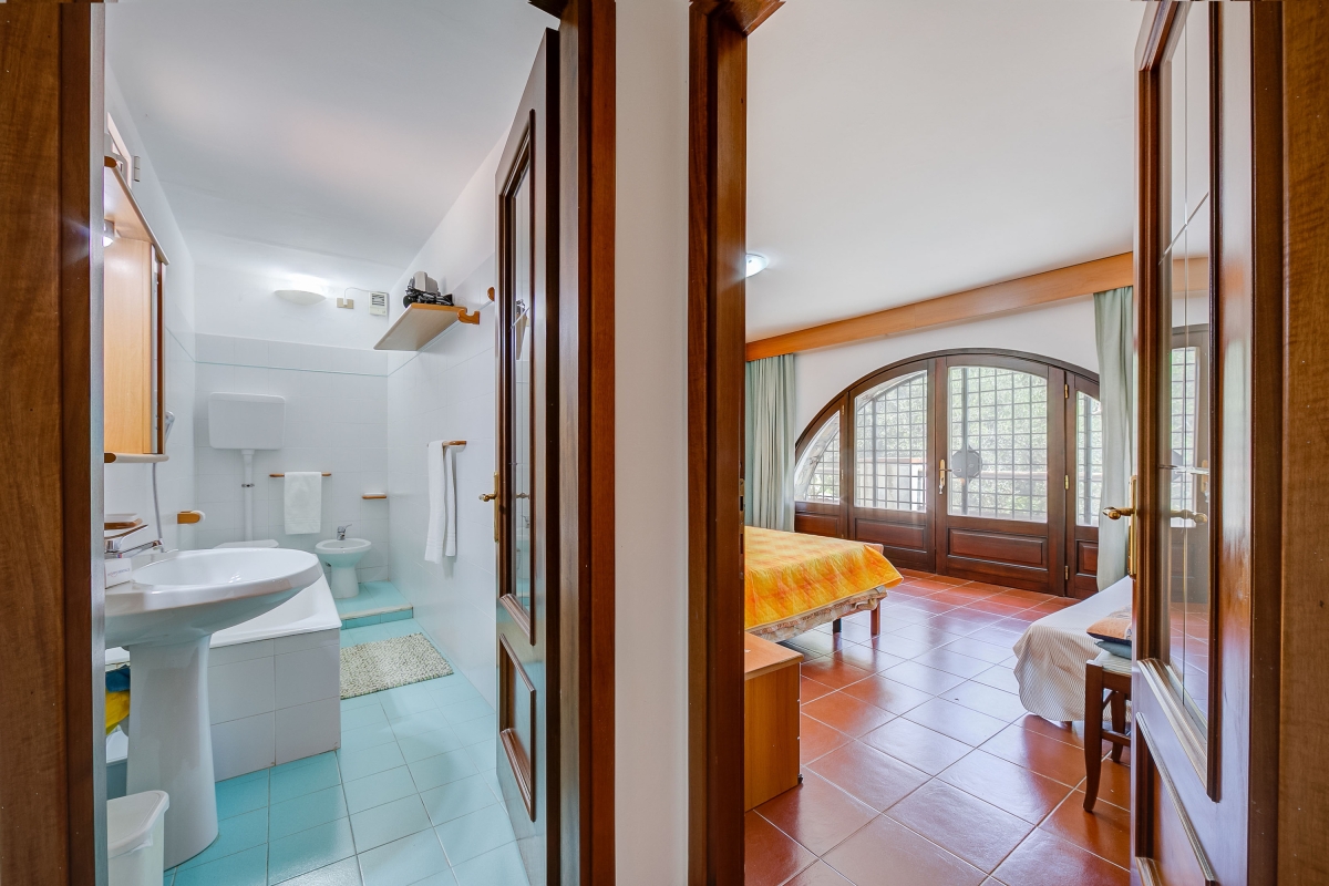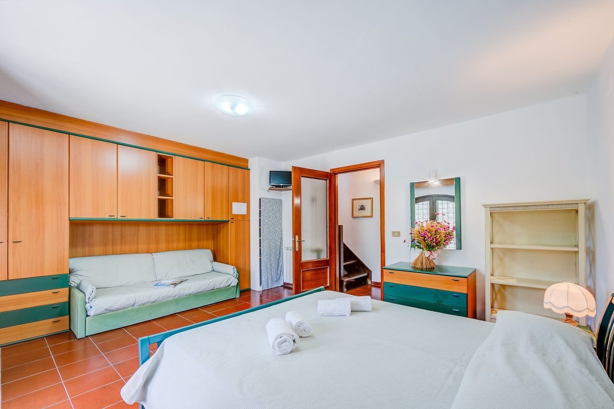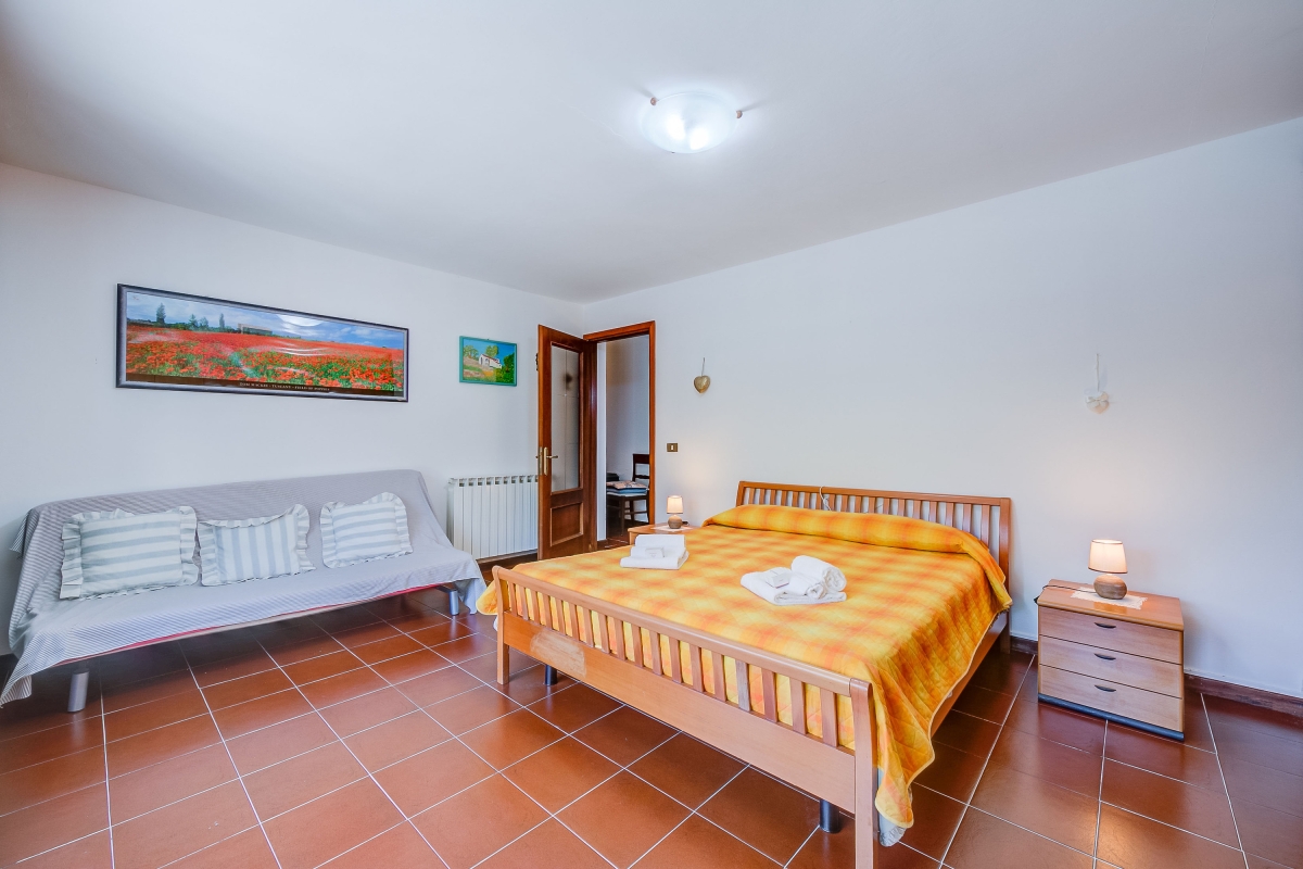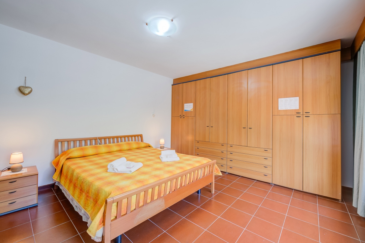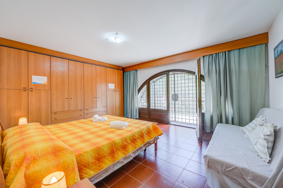 Bedroom 2: The second bedroom has large arched double doors leading to the lower terrace. It is furnished with a double bed, a large wardrobe and a sofa.