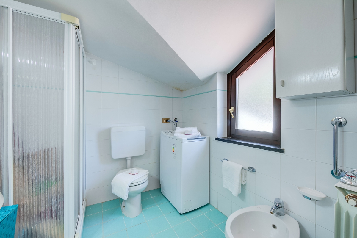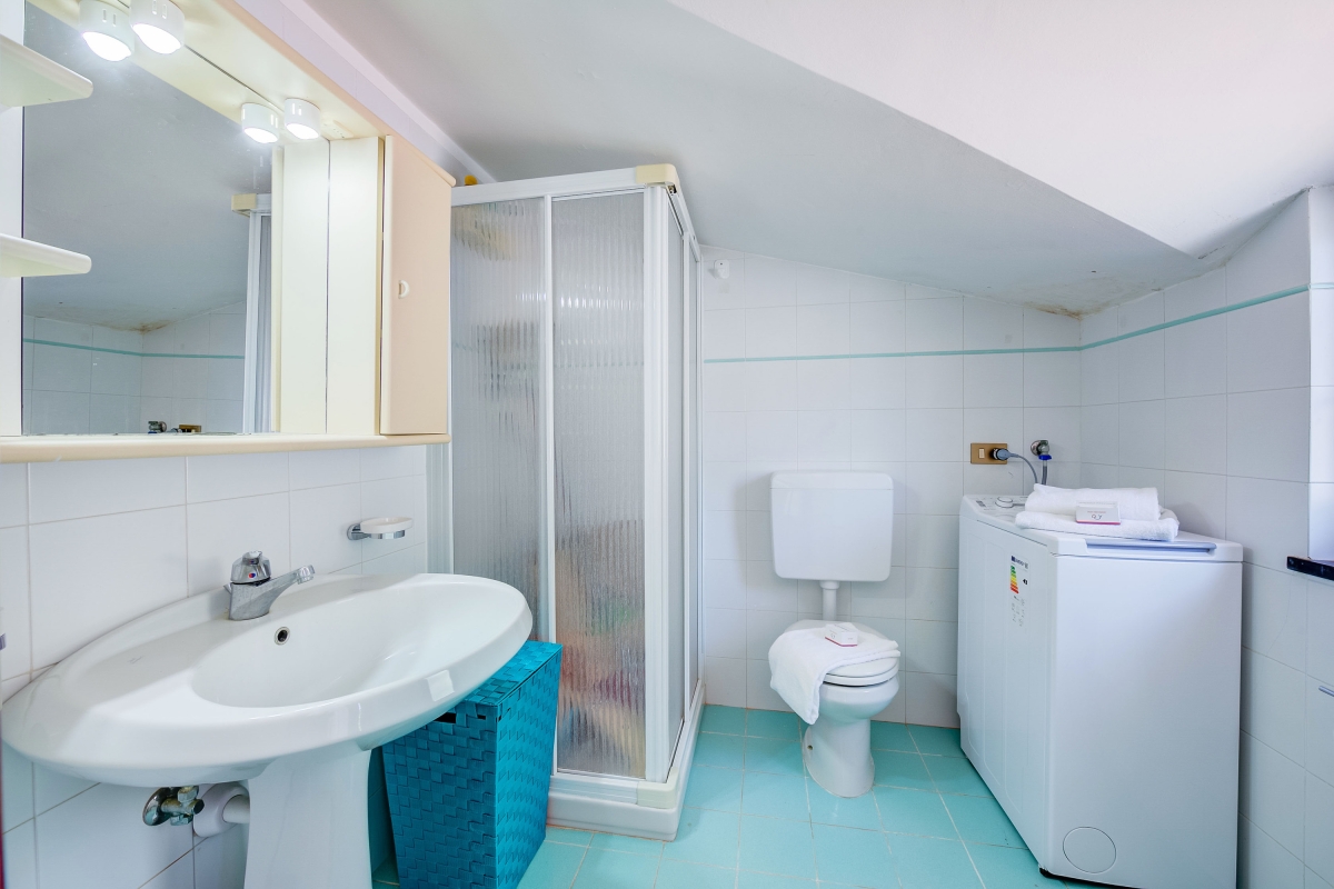 Bathroom 1: The modern, fresh bathroom, has a glass shower, basin, bidet, washing machine and WC.