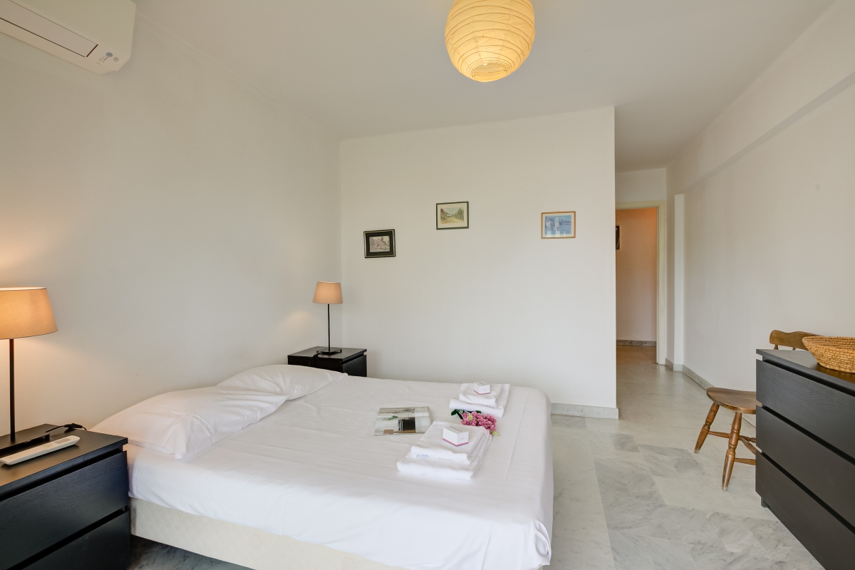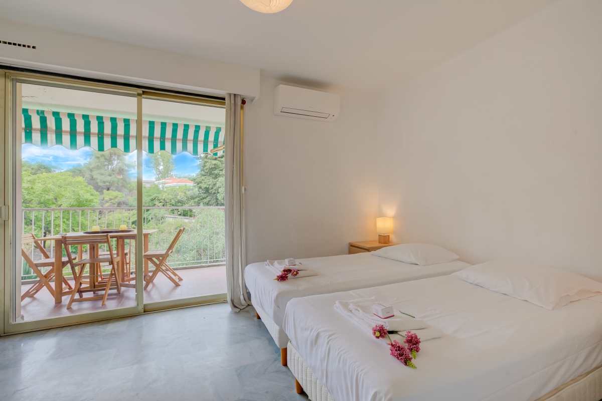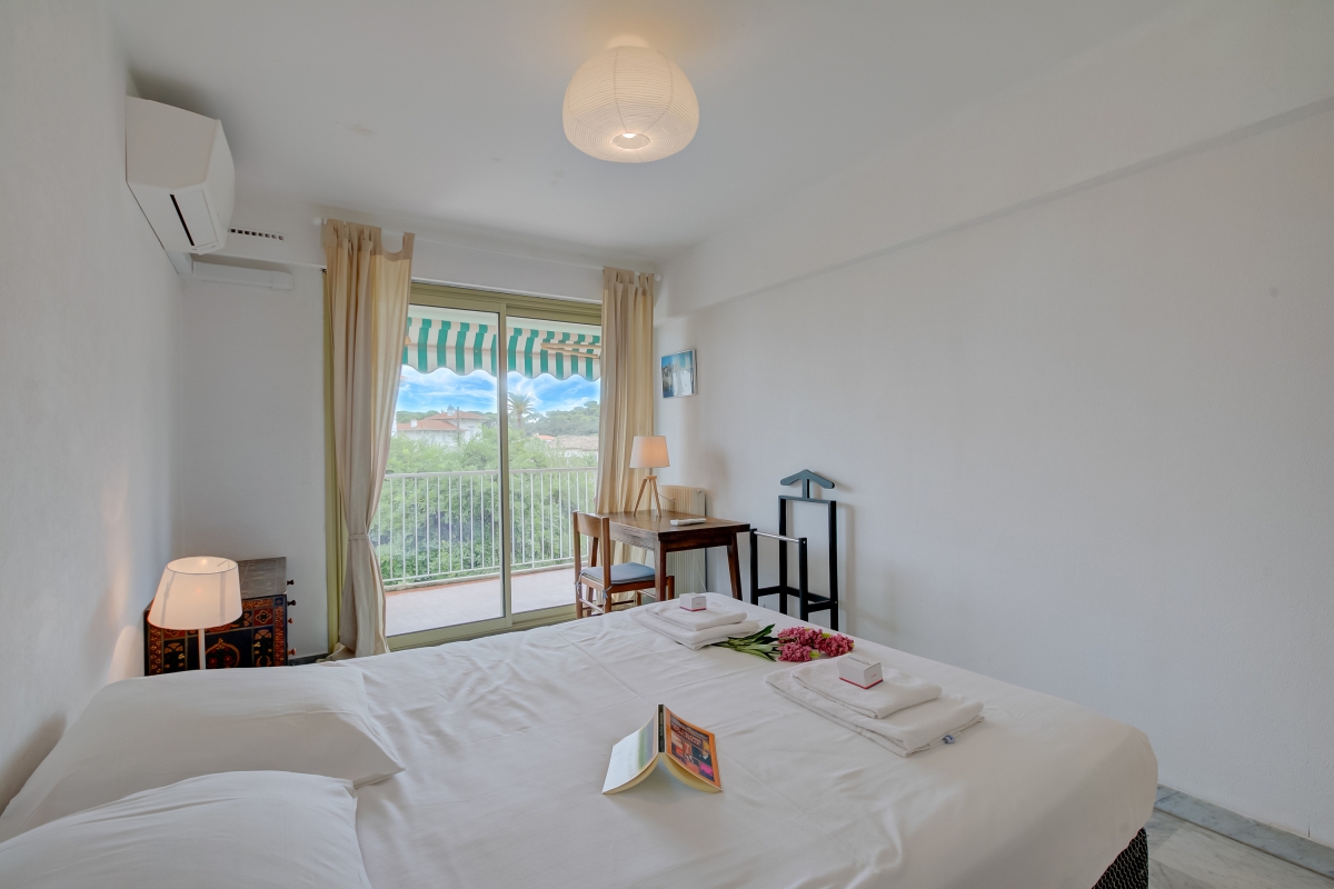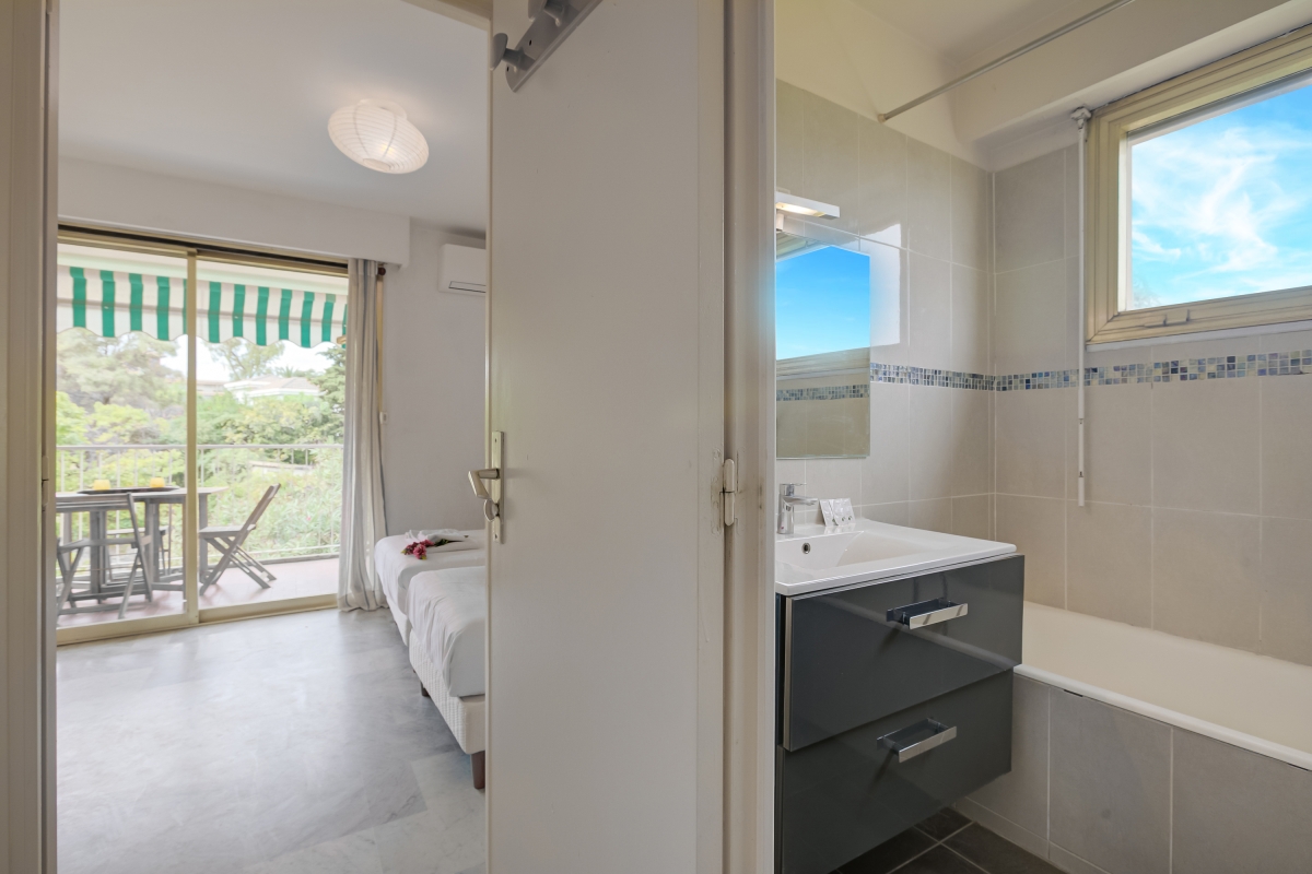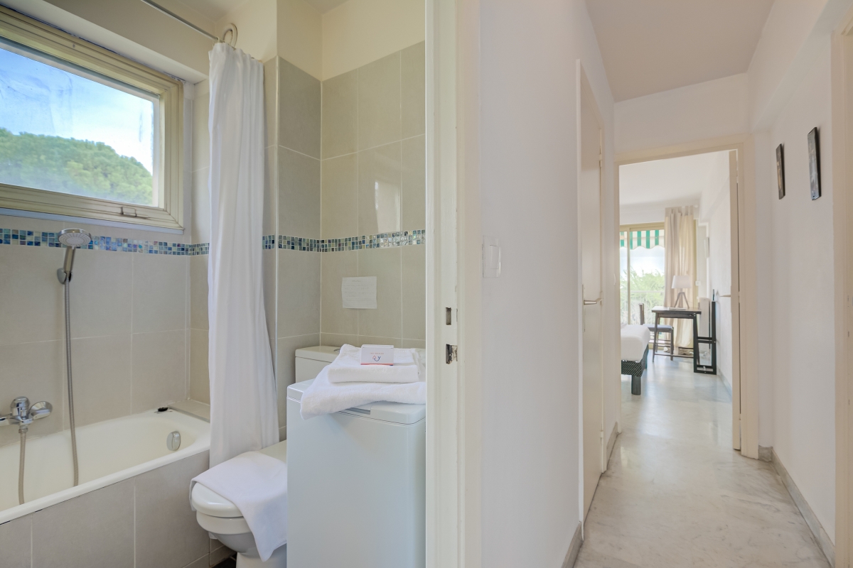 Located just a few steps away from the La Salis beaches, as well as close to shops, the sea, and the iconic Garoupe lighthouse, this luxurious first-floor apartment is an ideal retreat. With 3 bedrooms and 2 bathrooms, it comfortably accommodates up to 6 guests. Inside, the apartment features an elegantly designed open living room with access to a spacious shaded terrace, providing breathtaking views of the lush residential park. The beautifully equipped kitchen, complete with essential appliances like a dishwasher, oven, microwave, fridge and also offers a breakfast corner and access to a second terrace.