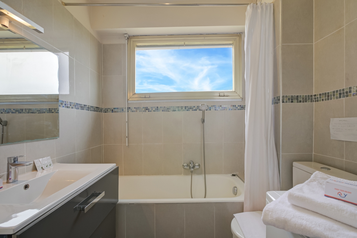 Bathroom 1: A full bathroom with a bath with shower and WC.