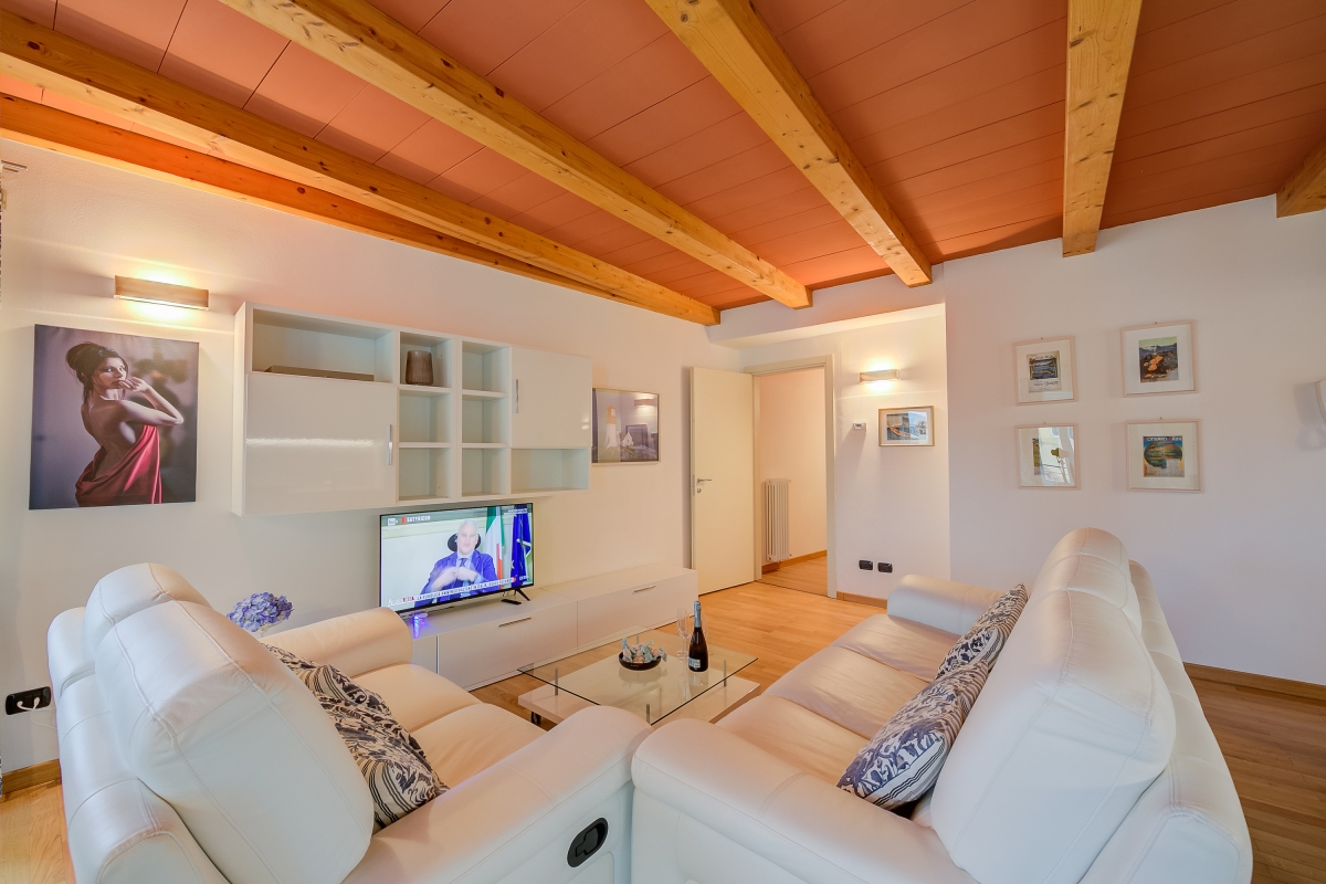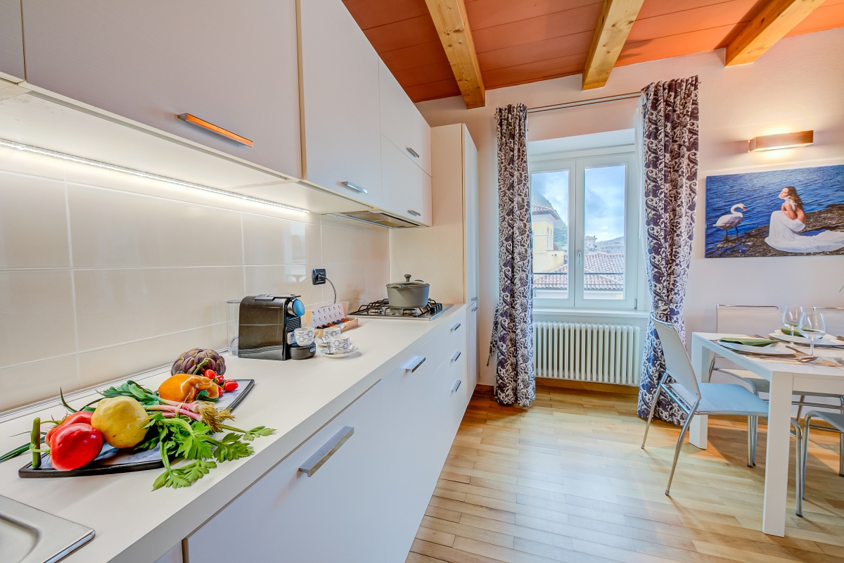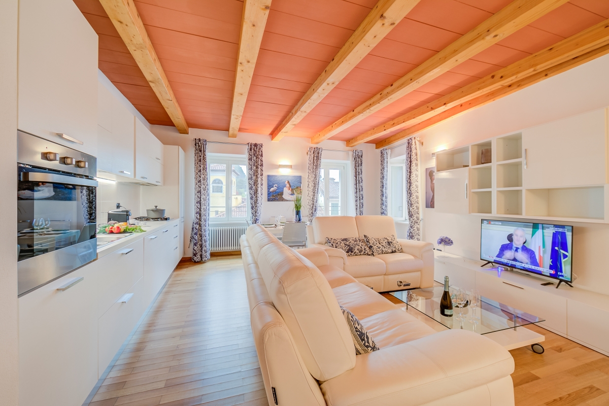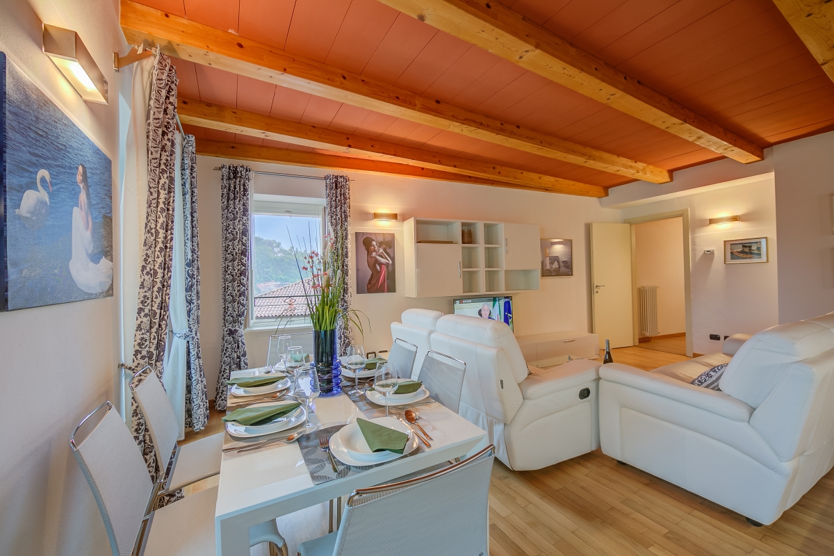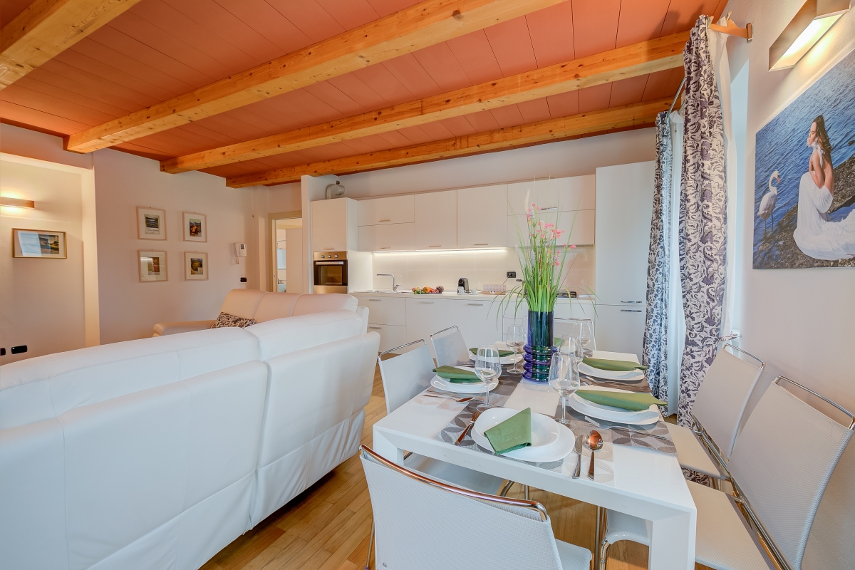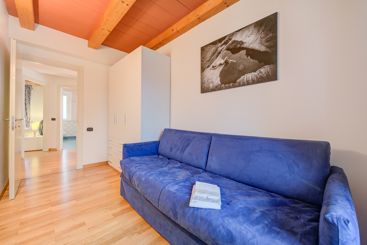 Ideal for up to 4 guests, this sun-soaked 2-bedroom retreat is located on the top two floors of the building and offers convenient lift access and modern amenities for a completely carefree holiday. Inside, the modern apartment has an open, fully-furnished and cosy lake-view living room with a SmartTV and a 2-seater sofa with a footrest-lifting mechanism for relaxation. This is completed by a well-equipped kitchen with a Nespresso machine, dishwasher, cooker hob, microwave, oven, electric kettle, toaster and fridge with freezer.
