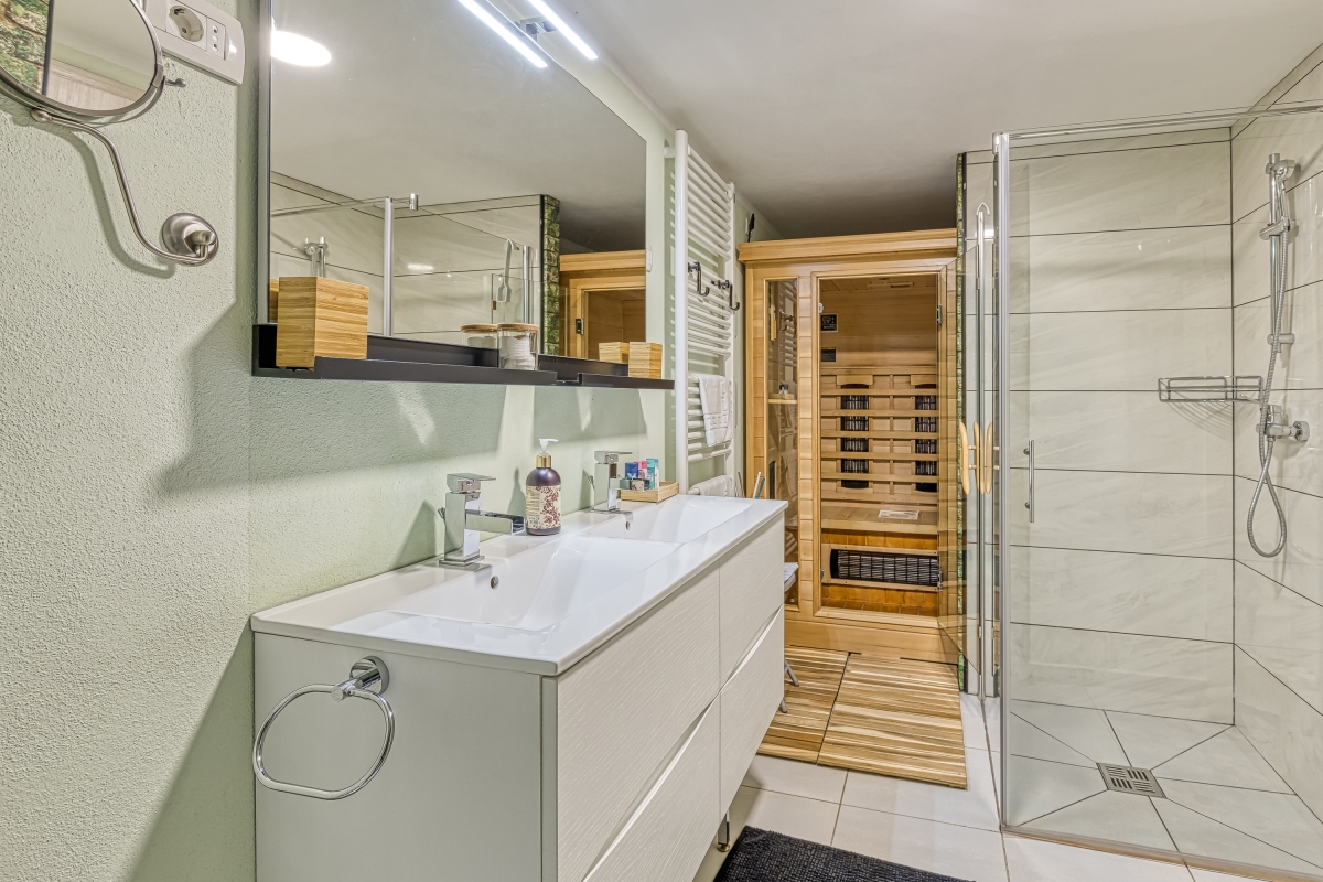 Surrounded by tranquil mountain views and greenery, this 2-level cottage for 5 is the perfect place to relax and unwind. With air conditioning and central heating, guests can stay comfortable no matter the season, enjoy open-air dining and barbeques on the cottage's terrace, or indulge in a relaxing session in the infra-red sauna.