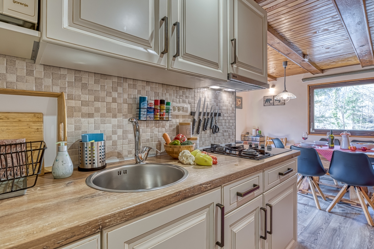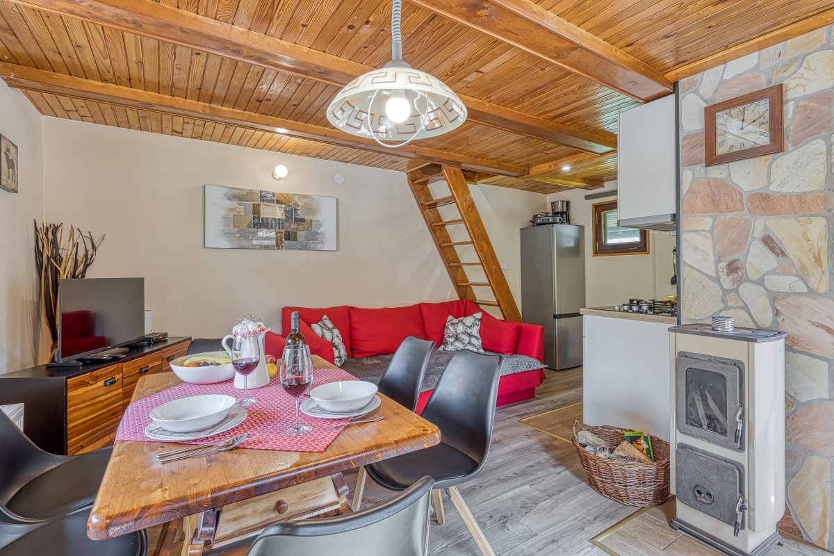 Inside, the cottage has an open living room with dining and a fully-equipped kitchen with a microwave, oven, american style coffee machine, fridge, and toaster, providing guests with everything they need to prepare delicious meals. For a refreshing swim or relaxing day by the river, guests have access to a private beach on the Kolpa River. Experience the beauty of Slovenia from the comfort of this cosy and peaceful riverside cottage.