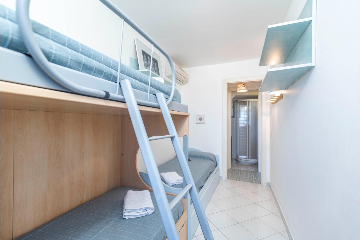 Bedroom 2: The second bedroom is furnished with bunk beds, a single bed and a chest of drawers