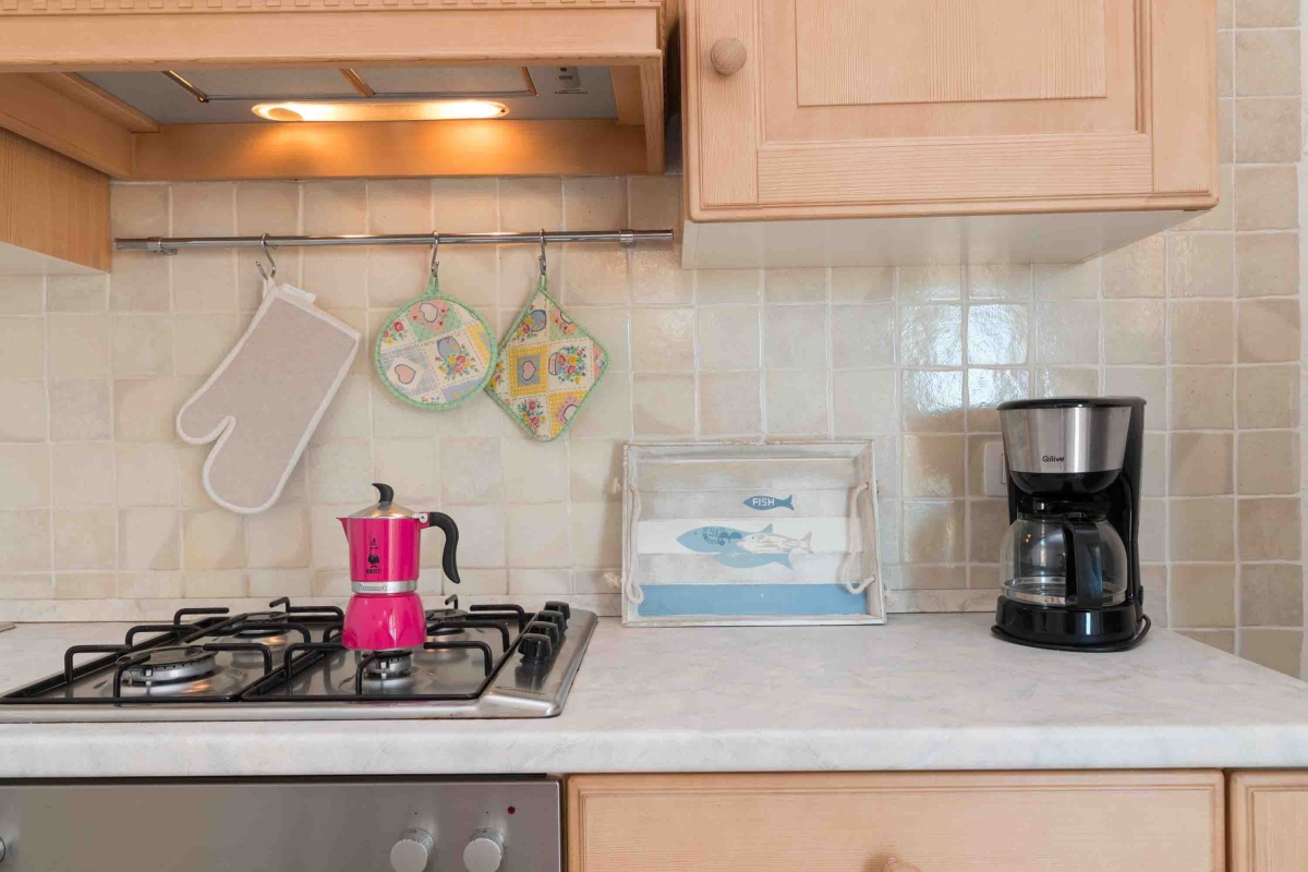 Inside, the air-conditioned property has a living room with a dining table, a sofa, and a flat-screen TV. The kitchenette is equipped with a stove, coffee machine, oven, refrigerator and freezer, and a dishwasher.