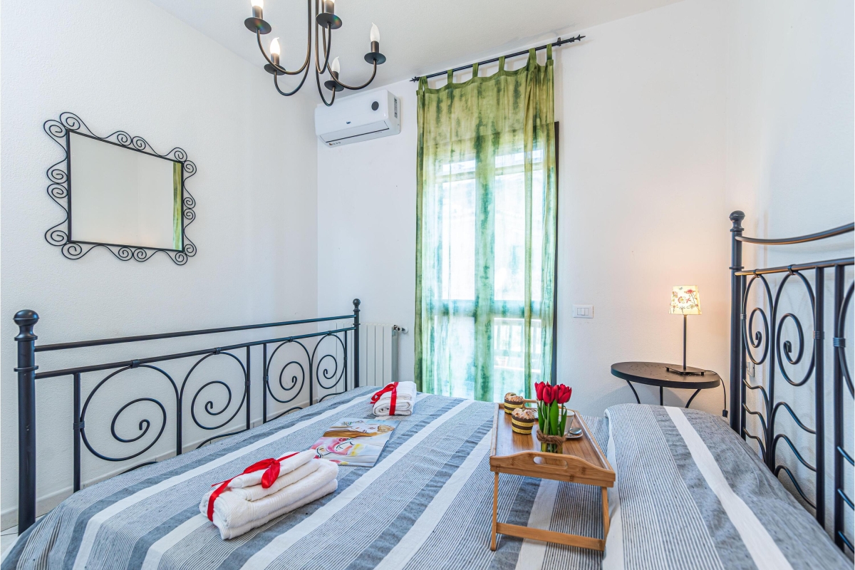 This ground-floor apartment has a private garden, a covered veranda with table and chairs, outdoor shower and sun loungers, a living room with dining and living area, a kitchenette with Nespresso machine, a double bedroom, a twin bedroom, and a bathroom.