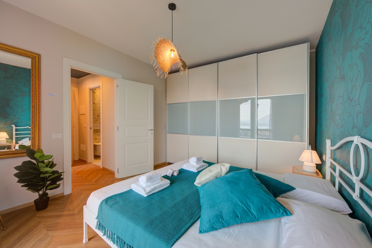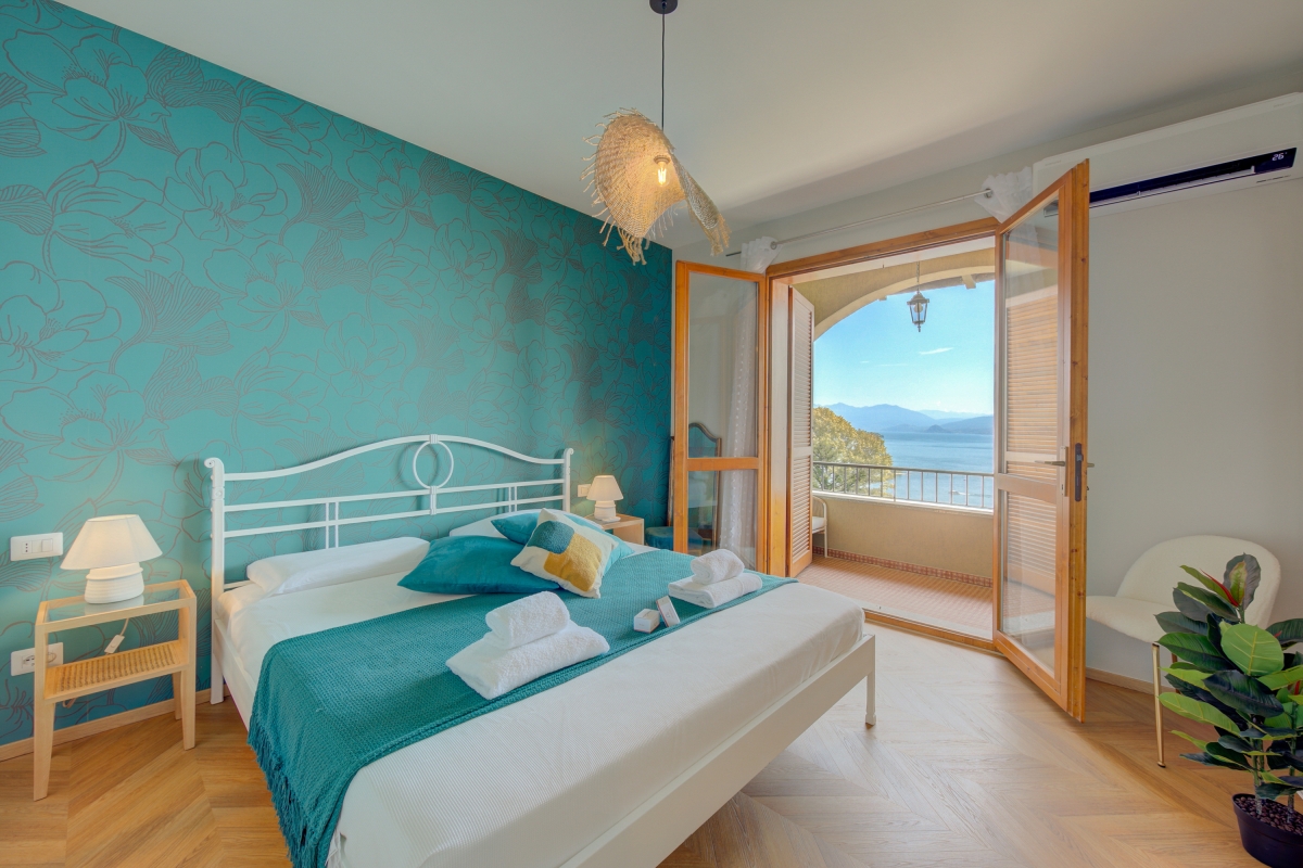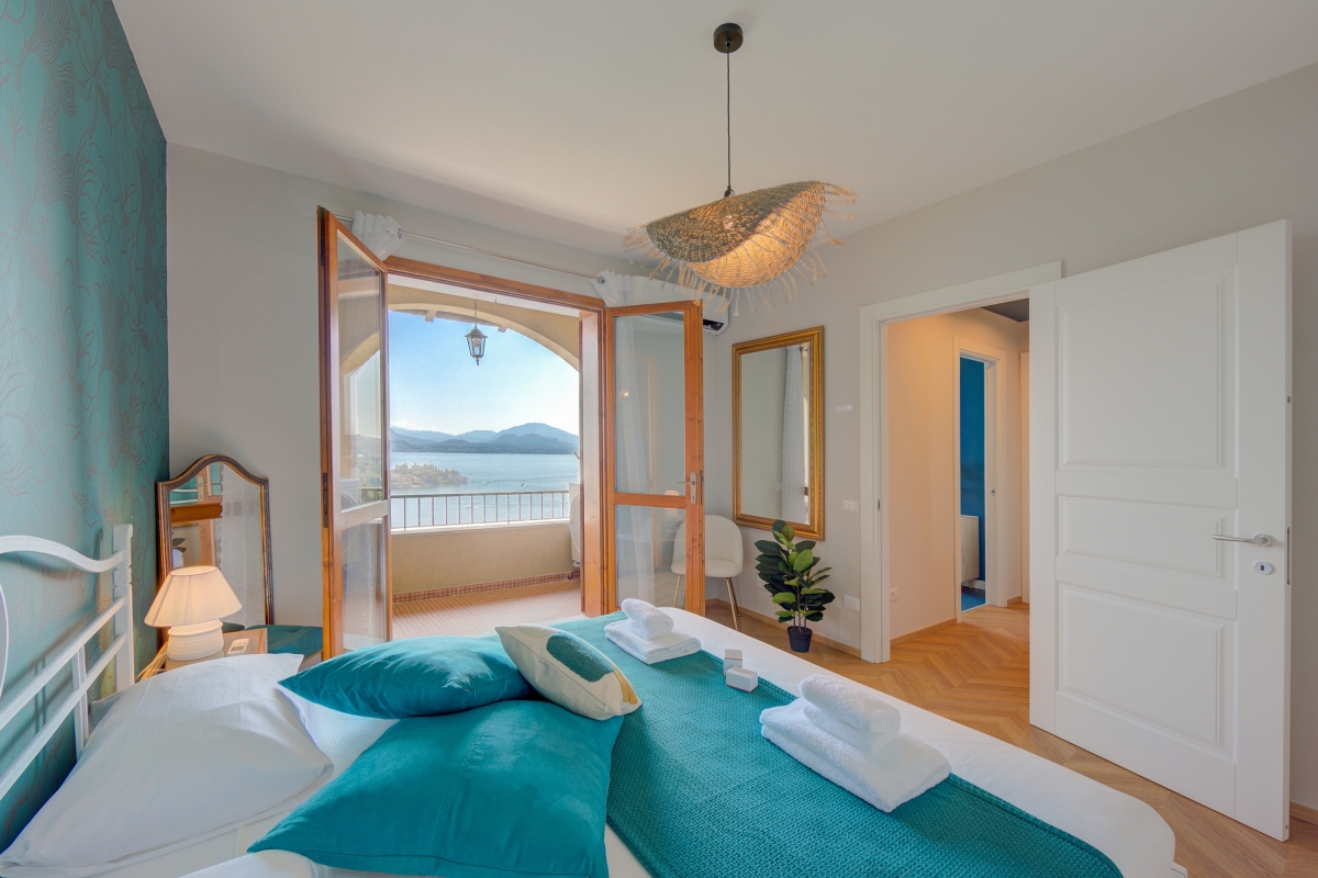 Bedroom 1: A lake-view bedroom with a king-size double bed, and direct balcony access.