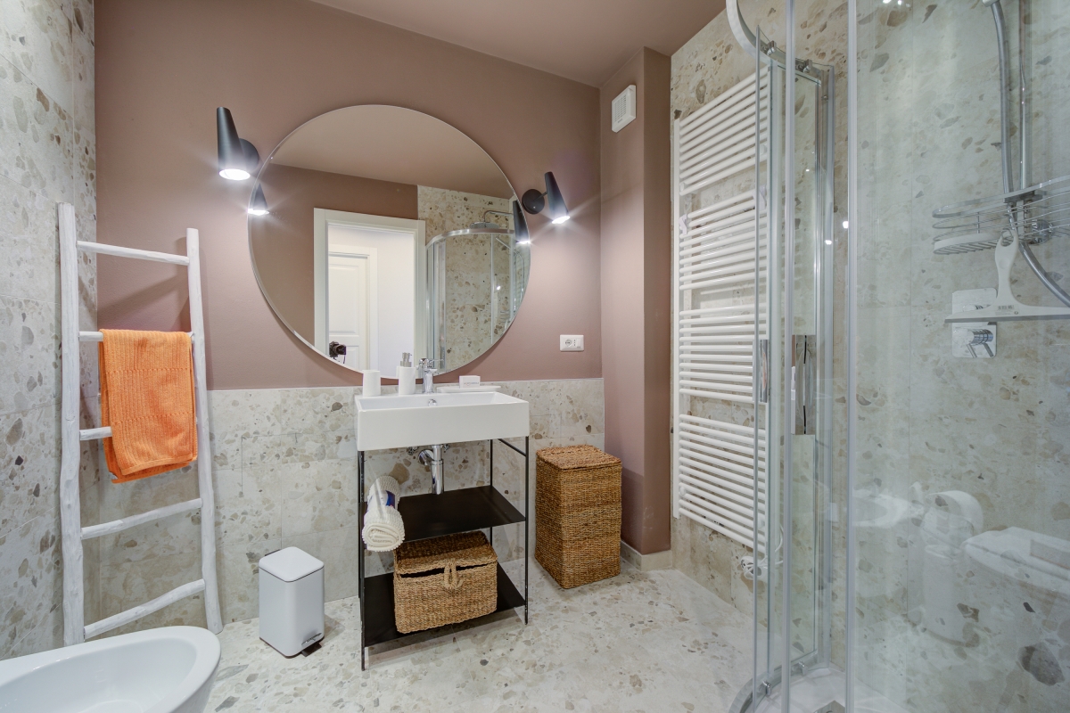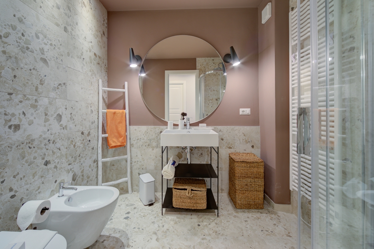 Bathroom 1: The beautiful modern family bathroom has a shower, mirror, WC, bidet, and hairdryer.