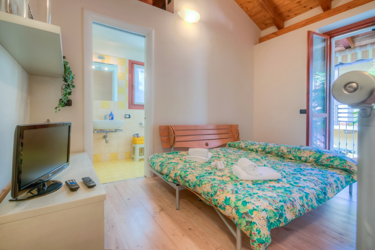 First Floor Bedroom: The balcony bedroom has a double sofa bed, Smart TV, a wardrobe and a modern ensuite bathroom.