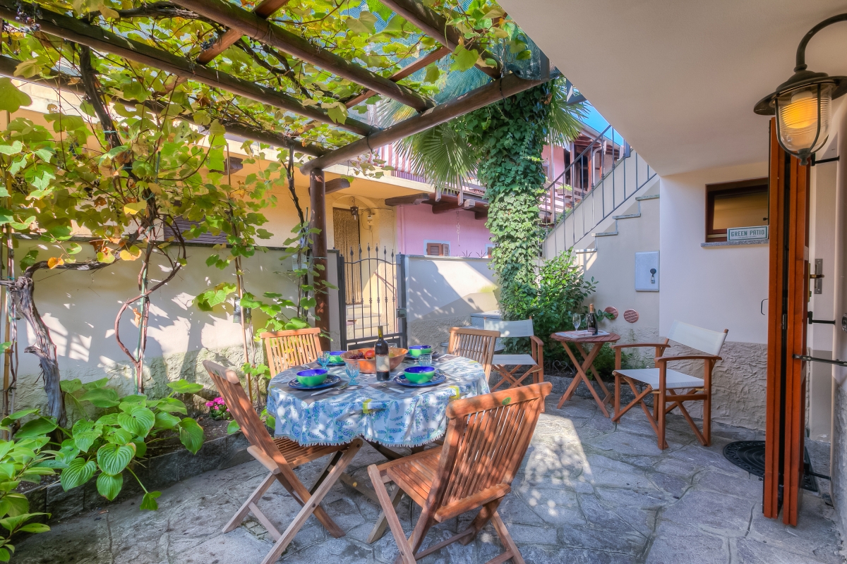 Located in the peaceful Meina centre and splashed with sunshine, this holiday home for 3 is perfect for a relaxing vacation for couples and families at Lake Maggiore. The holiday home is reached by walking through a fragrant canopy of strawberry grapes that leads you into a cosy oasis complemented by an open-air dining setup to enjoy meals outside.