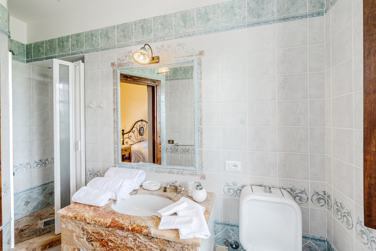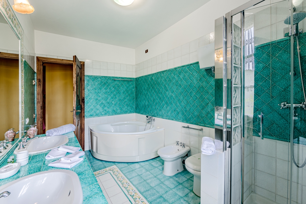 All 6 of the pretty, tiled en suite bathrooms have a bath, shower, basin, bidet and WC. 2 of the 6 bathrooms feature a jacuzzi each.