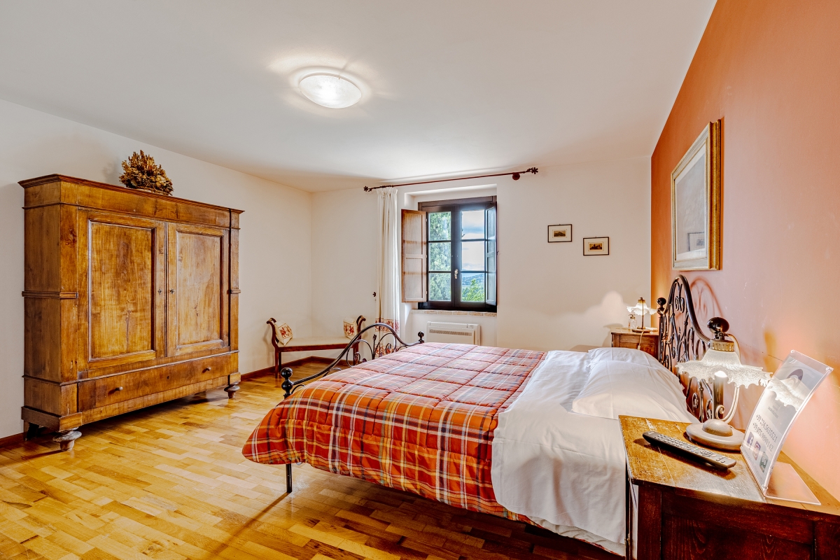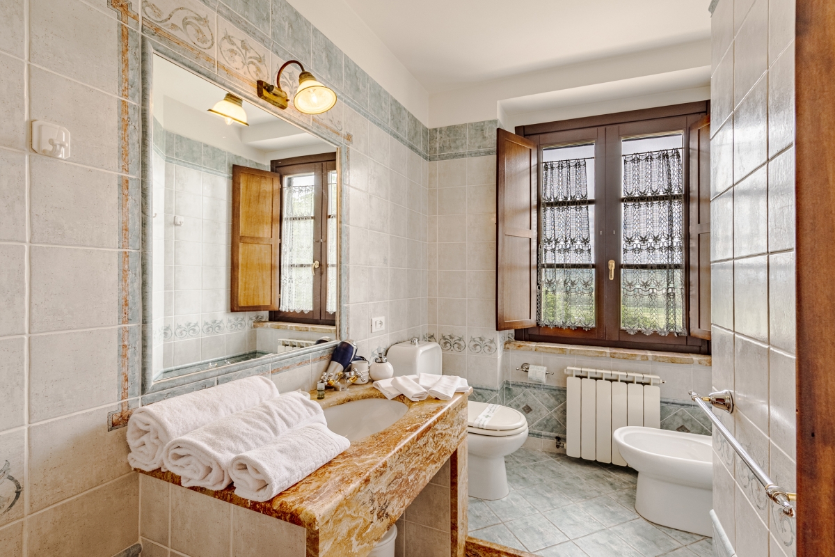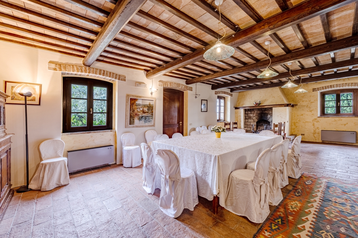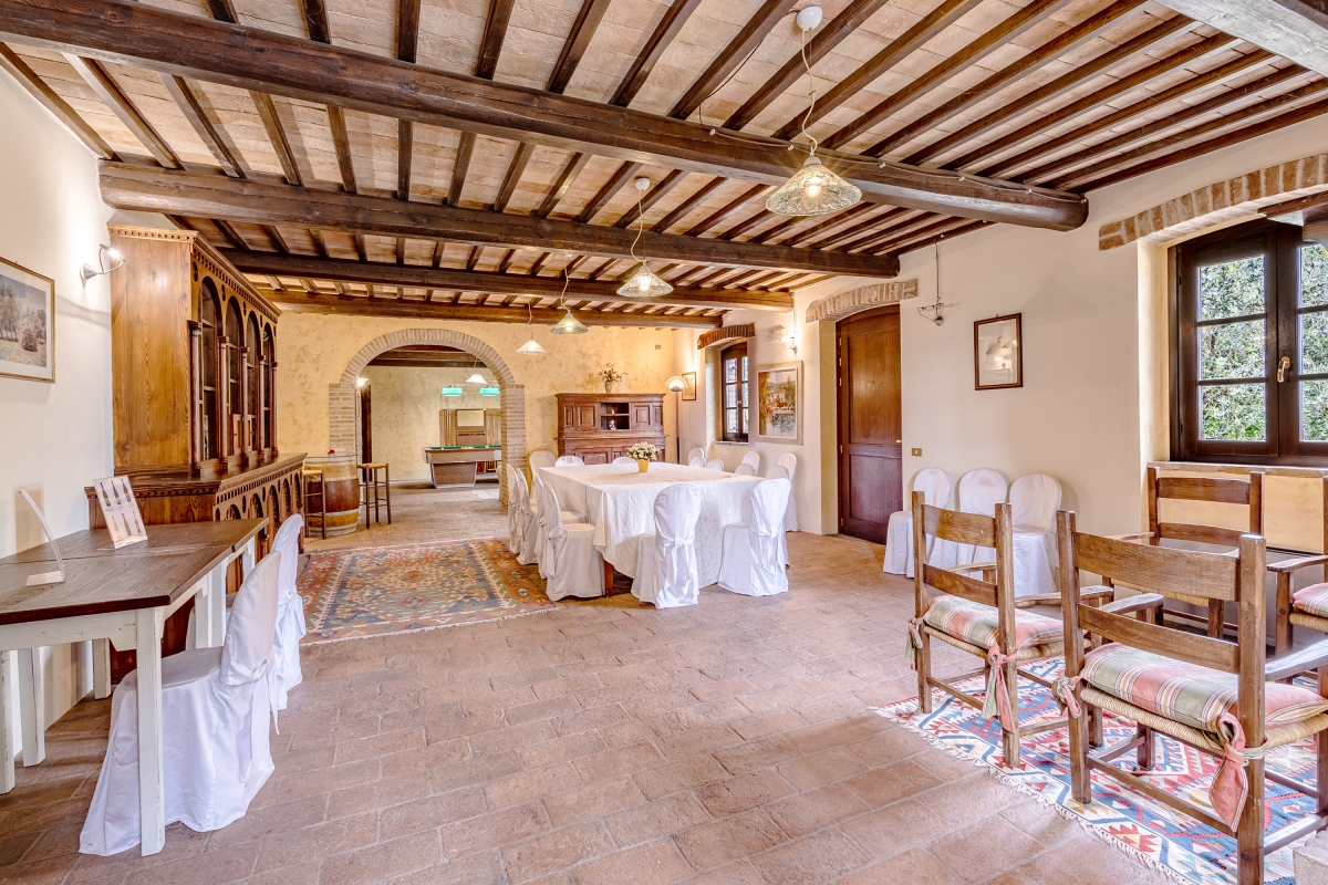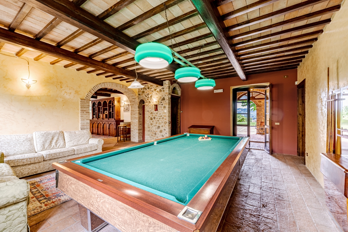 With its own private swimming pool and large gardens, the villa can sleep up to 12 people. The elegant ground floor, with terracotta tiles and traditional beamed ceilings, has a dining room which can accommodate 12 people with an open hearth, ideal for winter fires; a large games/sitting area, a full-size pool table and a spacious kitchen, with a wooden table for more casual dining. The kitchen is equipped with a drip coffee machine, cooker hob and oven, microwave, dishwasher, fridge, freezer and toaster. A door from the kitchen leads to the charming, brick-vaulted loggia, where guests can dine al fresco, sheltered from the heat of the midday sun.