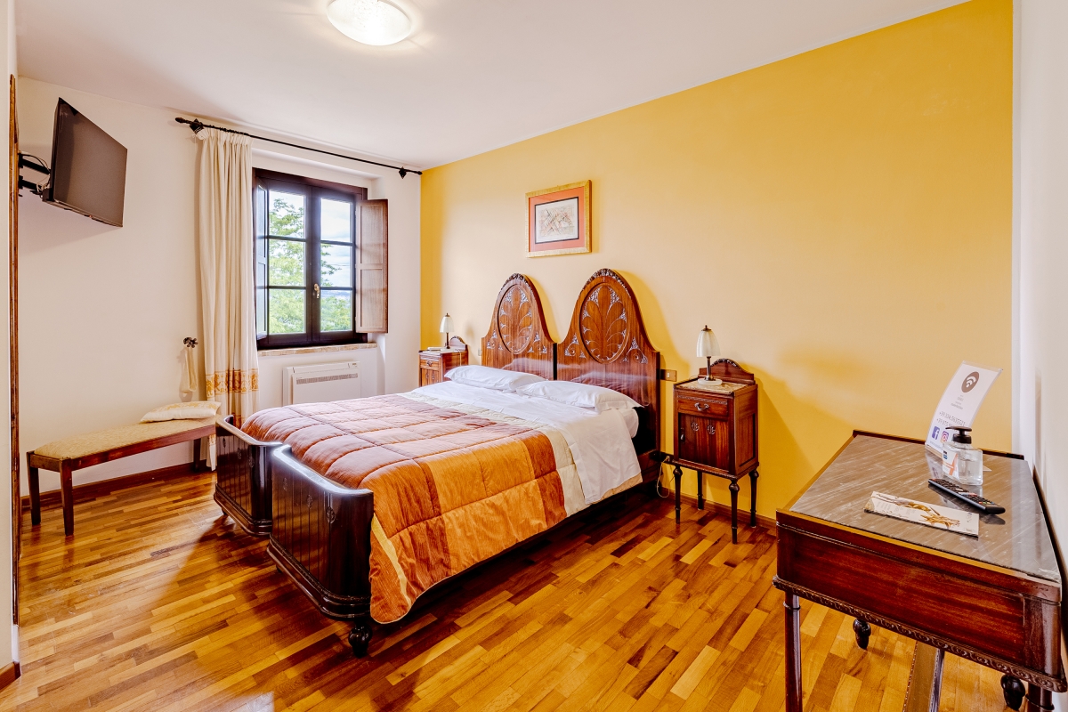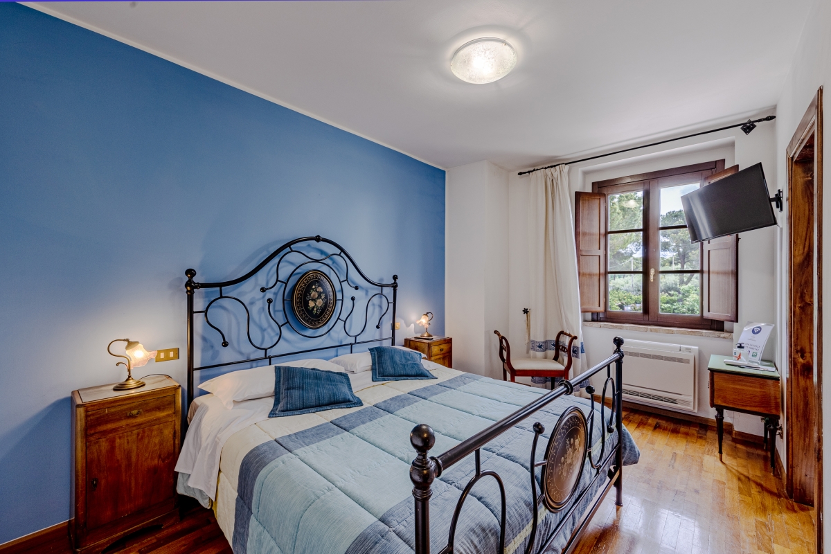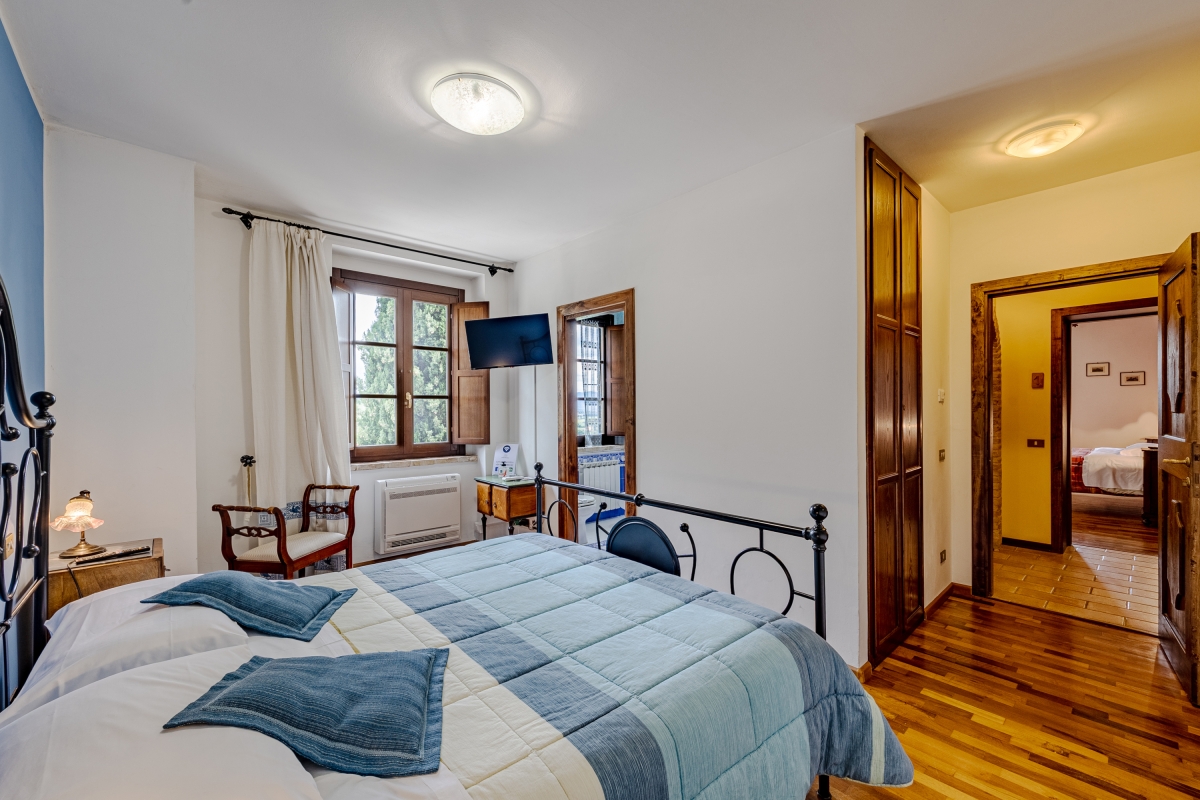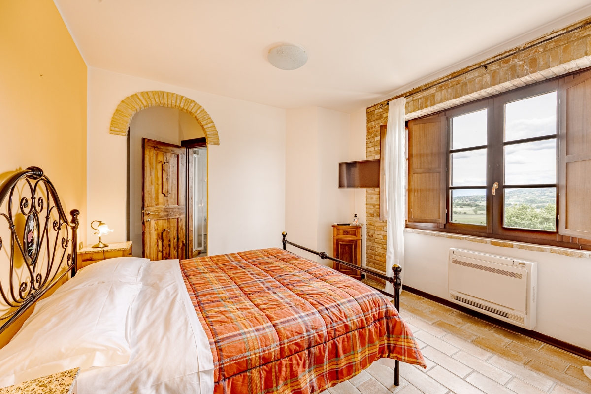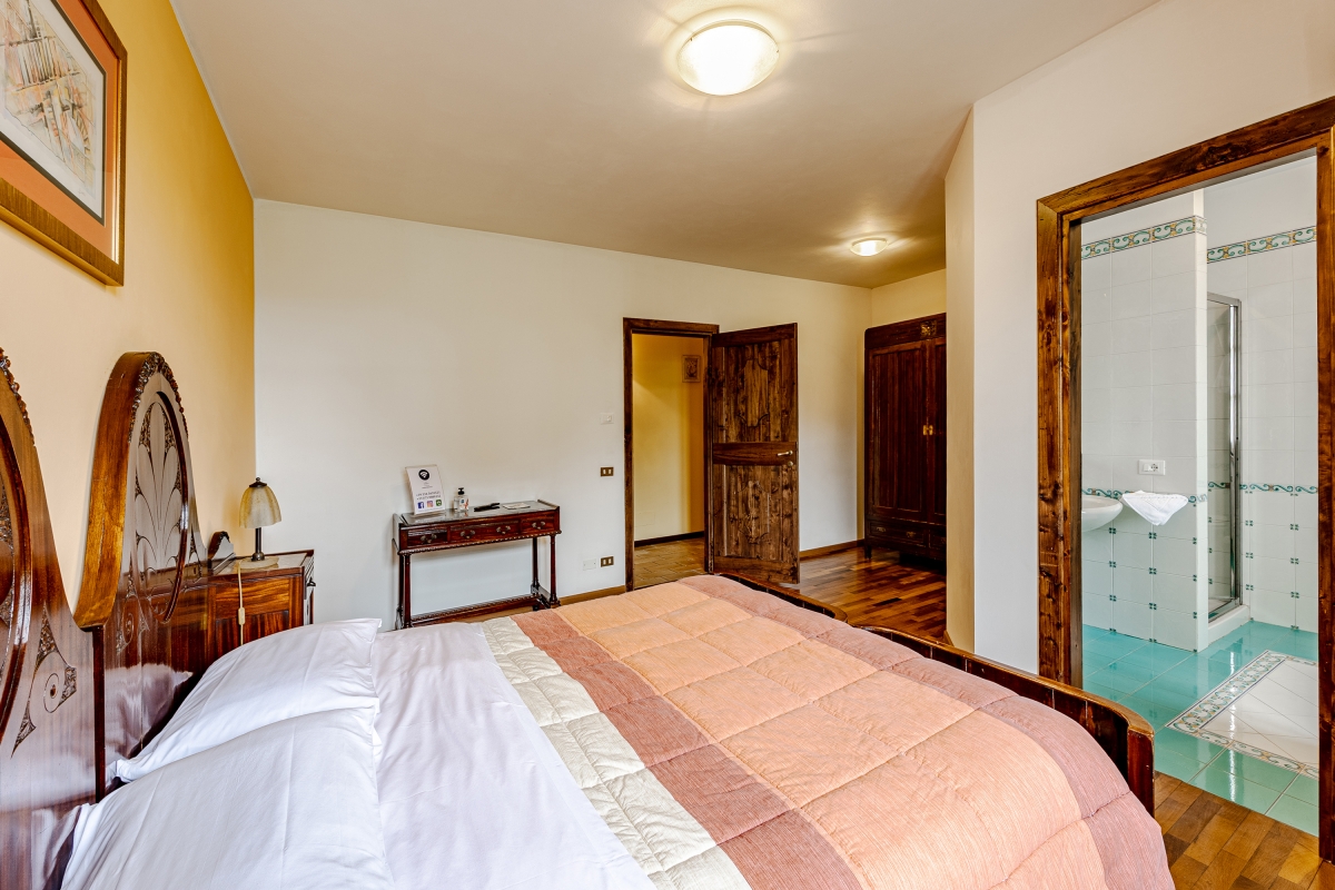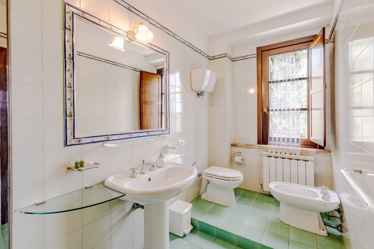 With its own private swimming pool and large gardens, the villa can sleep up to 12 people. The elegant ground floor, with terracotta tiles and traditional beamed ceilings, has a dining room which can accommodate 12 people with an open hearth, ideal for winter fires; a large games/sitting area, a full-size pool table and a spacious kitchen, with a wooden table for more casual dining. The kitchen is equipped with a drip coffee machine, cooker hob and oven, microwave, dishwasher, fridge, freezer and toaster. A door from the kitchen leads to the charming, brick-vaulted loggia, where guests can dine al fresco, sheltered from the heat of the midday sun.