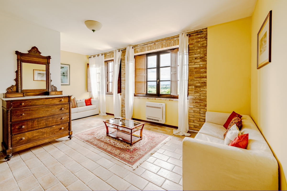 On the first floor of the villa, there is a more formal sitting room with sofas and lovely views over the surrounding countryside.