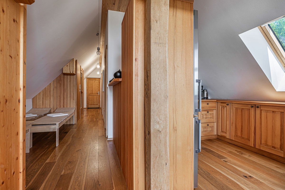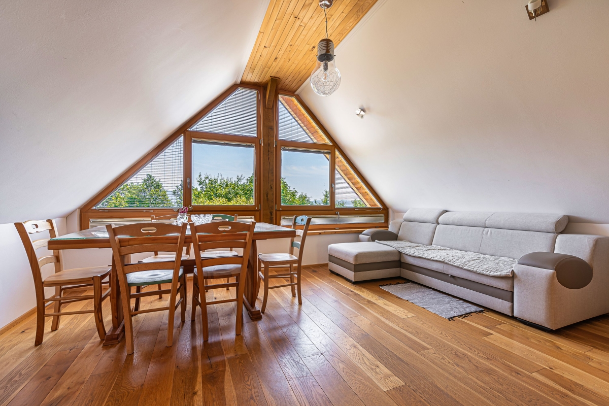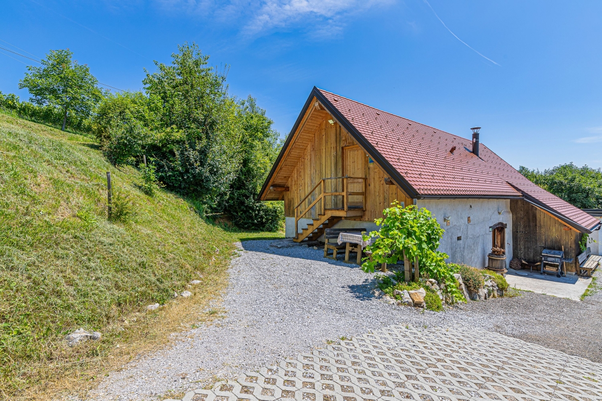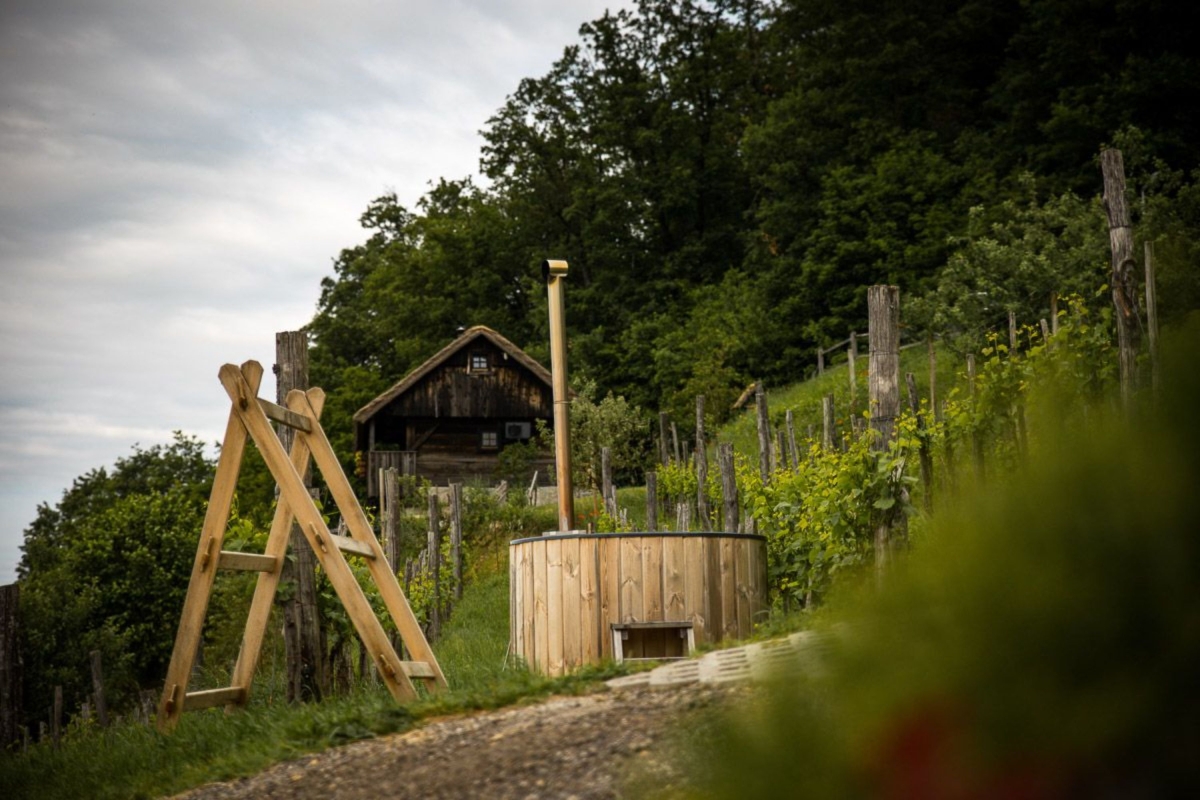 The cottage features a picturesque open-air dining area and a wine cellar where the host welcomes you and invites you for a tasting. In summer, you can enjoy a rustic experience and sleep in the attic under a thatched roof. In the immediate vicinity is a Finnish sauna in a 7,000-liter wooden barrel and a massage tub for total relaxation. You can also try homemade bread, salami and cheese. Seasonal vegetables and fruits from the garden are available to guests. It is possible to visit Matjaž's homestead, see the cultivation and indulge in wine tasting.