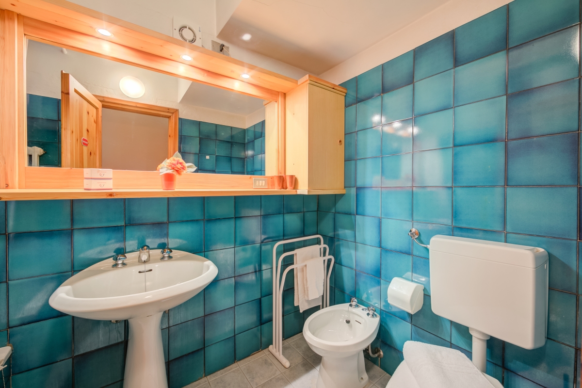 Bathroom: The turquoise tiled bathroom has a full bath with shower, basin, bidet and WC