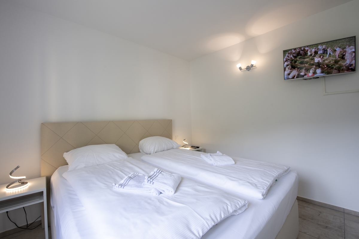 The sleeping area is furnished with a comfortable double bed and a wall-mounted, flat-screen TV