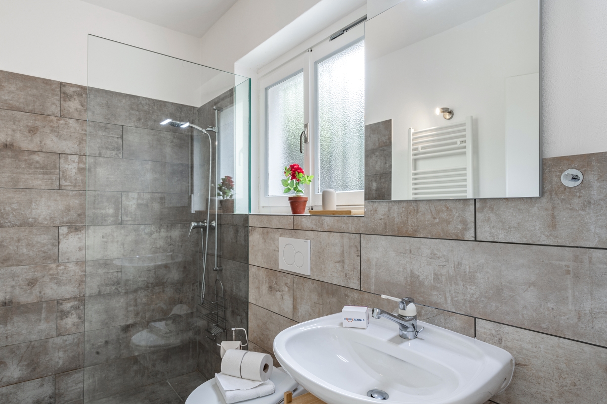 The modern bathroom is equipped with a shower, a washbasin and a WC