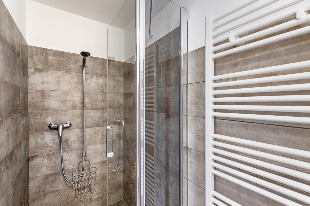 The modern bathroom is equipped with a shower, a washbasin and a WC