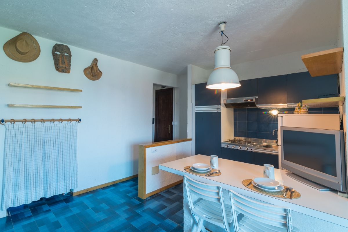 The apartment can sleep up to 3 people and consists of an open-plan living area, with French windows opening out onto a shaded balcony. The balcony has a dining table and chairs, so guests can dine al fresco and enjoy the sea view over to Tavolara Island. Inside, the living space has a bunk bed, which can be used as a sofa during the day. The room is also furnished with a dining table/breakfast bar, with a flat-screen TV. The adjacent kitchenette is equipped with a hob and fridge/freezer.