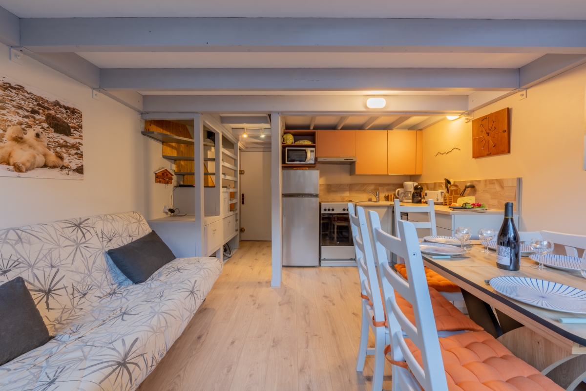 On the third floor (with lift), set in extensive communal gardens, this apartment sleeps 4 people. The décor is alpine but with a contemporary twist. The living room has large windows which look directly onto the mountains. There is a glass door that leads out onto a wooden balcony where you can sit and enjoy the view. Back indoors there is a sofa and a TV. The dining area, with a wooden table that seats 4, is next to the open-plan kitchen. The kitchen is equipped with a microwave, fridge and coffee machine.