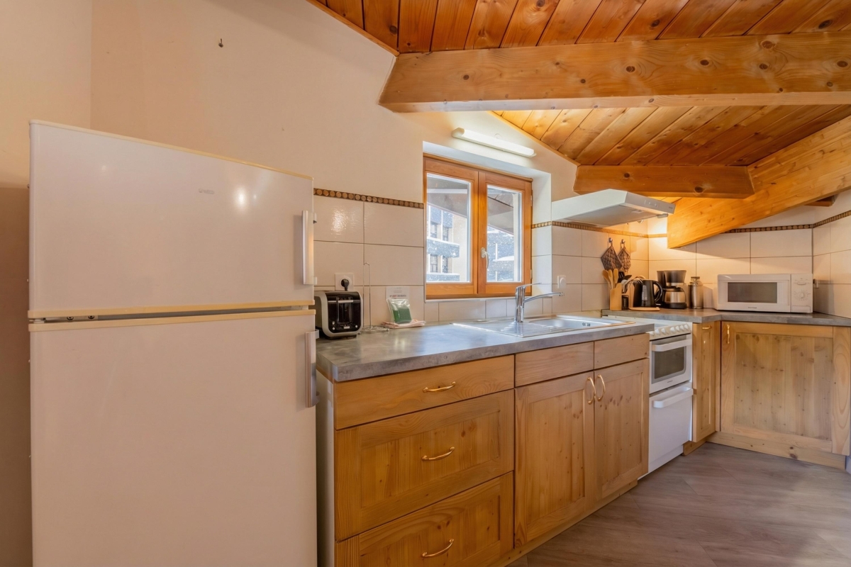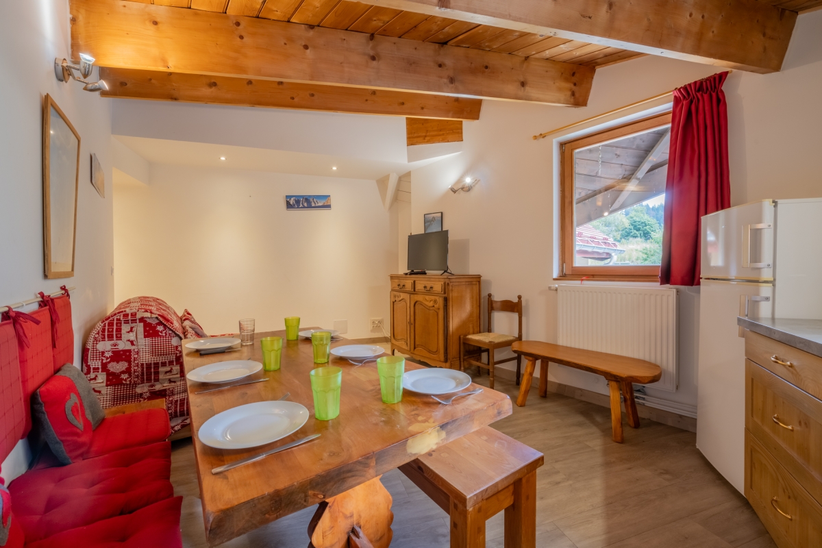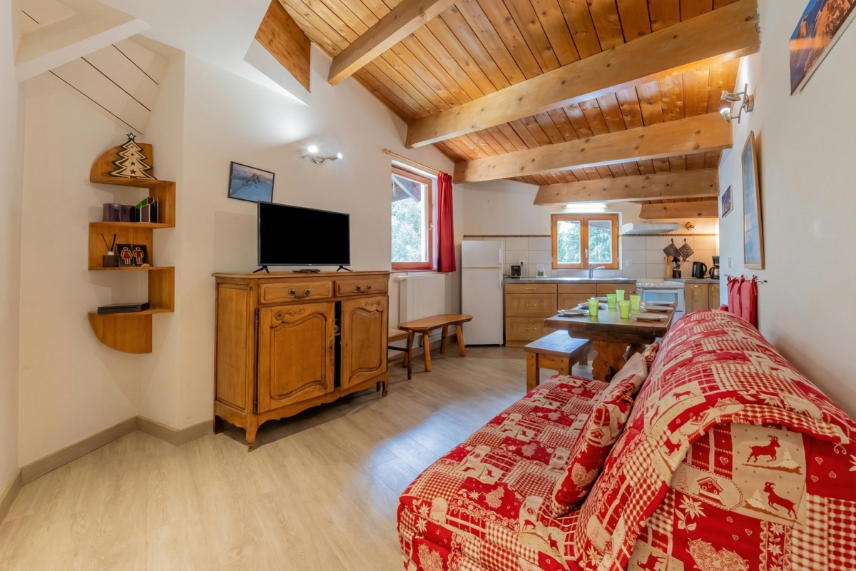 Tucked under the wooden eaves, with pieces of traditional mountain furniture, the apartment is warm and welcoming. Accessed through a staircase, this second-floor apartment features an open-plan living/dining area with the kitchen stretching around the corner. The seating area is furnished with a sofa, antique sideboard and a flat-screen TV. Next to the sofa is an attractive dining table with benches and chairs for 5. The wooden fitted kitchen is equipped with a cooker hob, oven, microwave, fridge/freezer and a drip coffee machine.