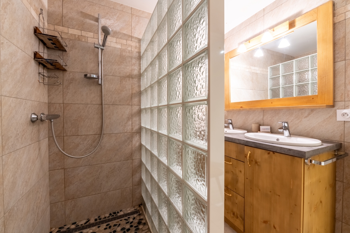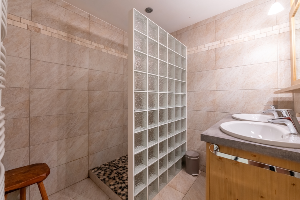 The stylish bathroom has a large, walk in shower and double basins