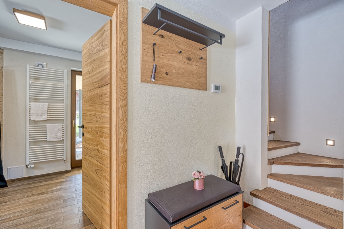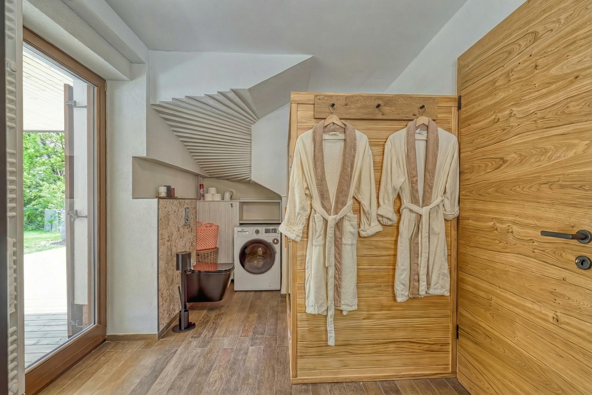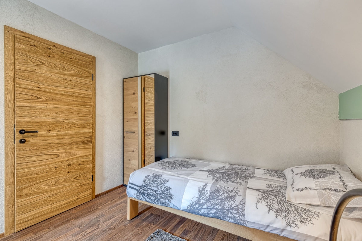 The contemporary chalet sleeps 5 people and is ideal for indoor/outdoor living. The open-plan living area has double glass doors leading out to the terrace. The sunny room is furnished with a sofa, wood-burning stove and flat screen TV. The wooden dining table seats up to 6 people and is next to the well-equipped kitchen. The open-plan kitchen has a cooker hob, oven, microwave, dishwasher, fridge/freezer and american style coffee machine.