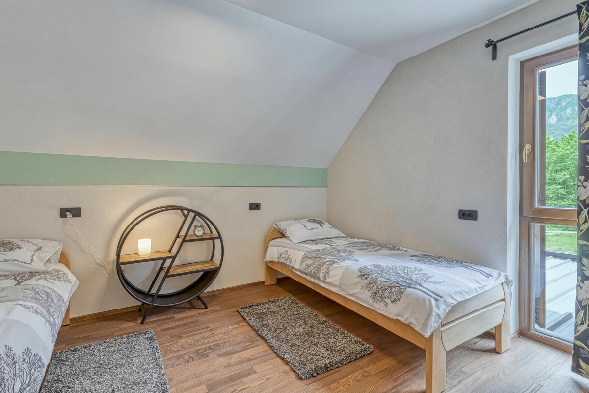 Bedroom 2: Another light-filled room with two single beds, wardrobe and glass door onto the balcony.