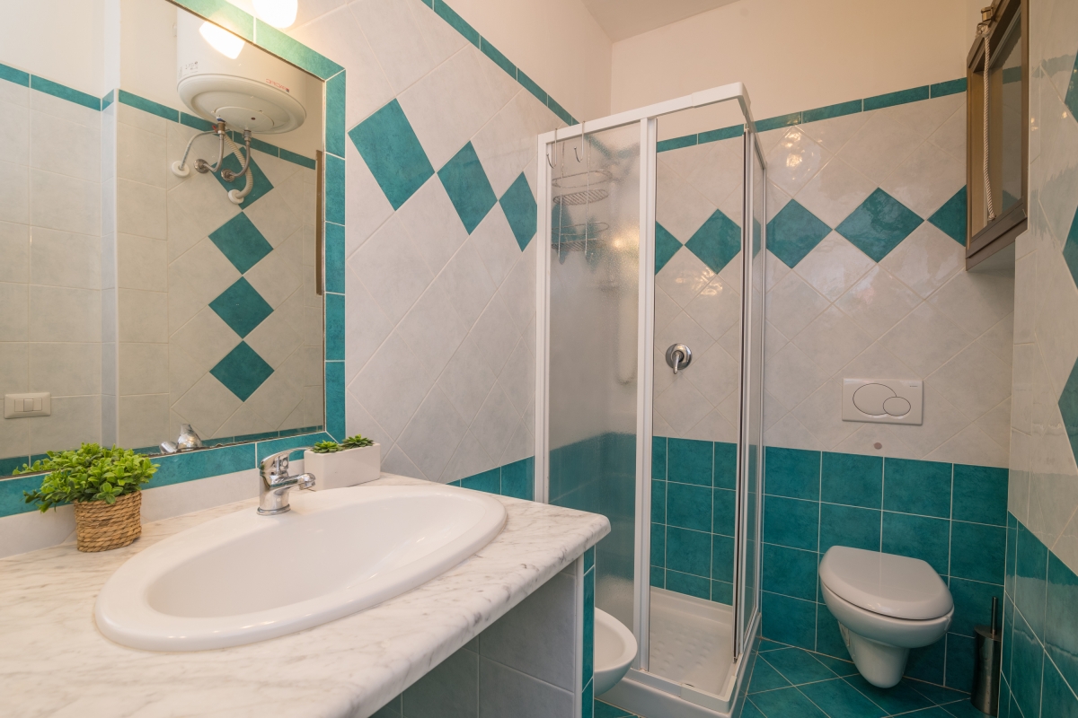 Bathroom: The tiled bathroom is equipped with a shower, a bidet, a washbasin and a WC