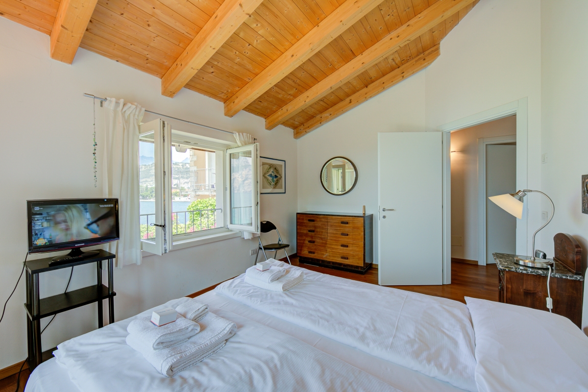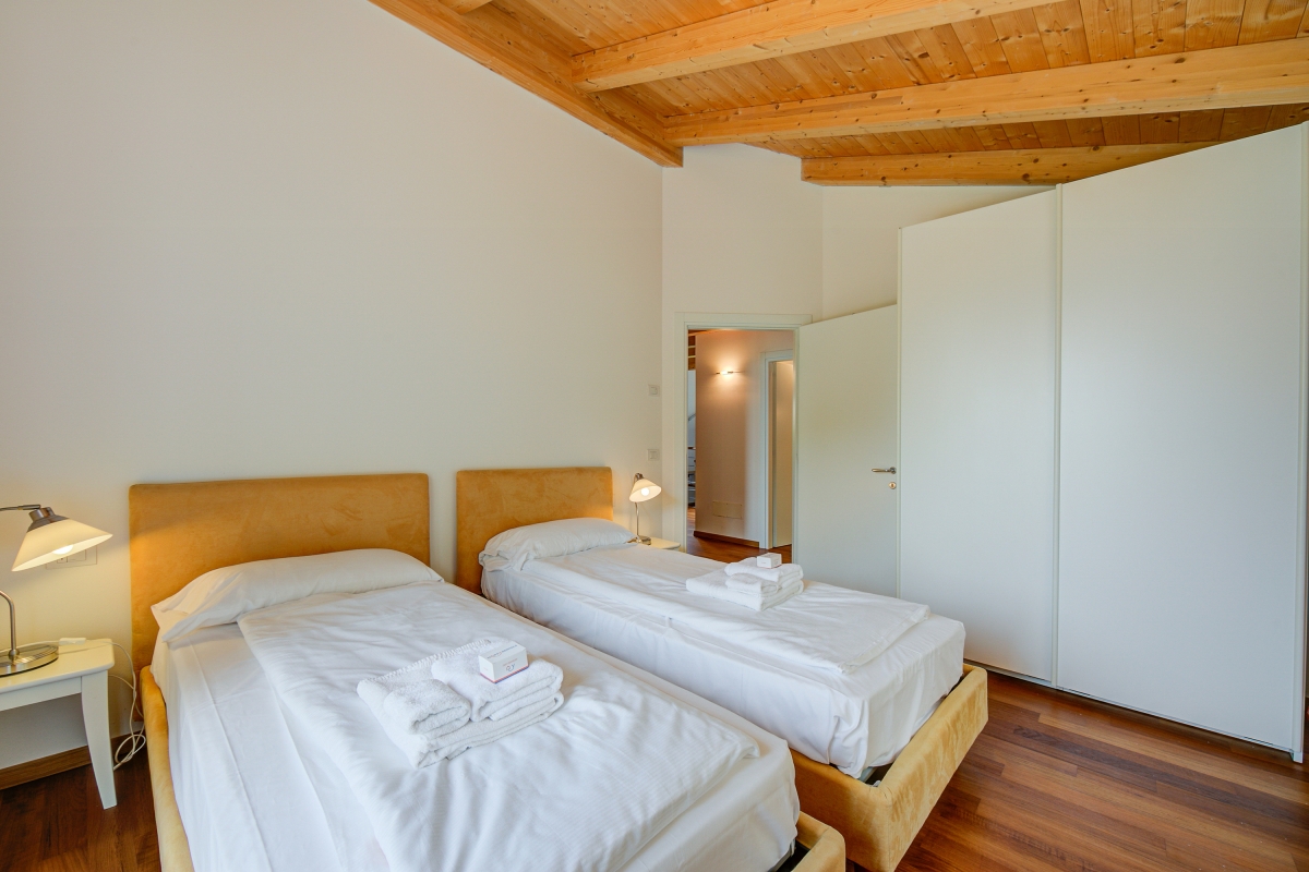Bedroom 2: A double room with a lake view balcony with 2 single beds and a wardrobe.
