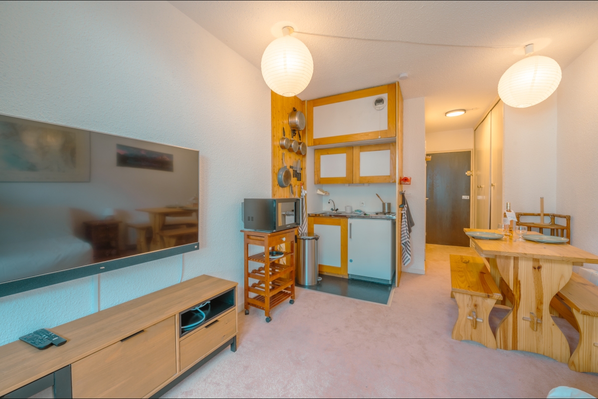 Located on the third floor, close to Aiguille du Midi ski lift, this charming holiday studio with lift and wheelchair access is perfect for a comfortable ski holiday in Chamonix. The cosy apartment is ideal couples and features a private balcony, where you can relax after a busy day outdoors. A kitchenette with a microwave, fridge, raclette, Nespresso coffee machine and fondue as well as a full bathroom with stylish fittings further complete a carefree stay here.