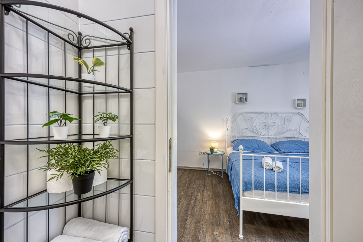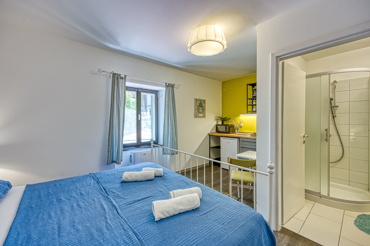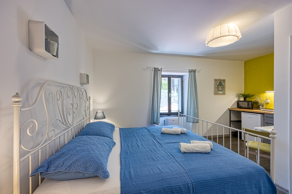 Located a stone’s throw from just about everything, this air-conditioned studio for 2 is for those who want to explore the gorgeous island of Lošinj without depending on any transportation. The first-floor apartment enjoys a sun-soaked Mediterranean garden with an open-air shared kitchen and dining area, ideal to prepare and enjoy summertime meals in a delightful holiday atmosphere.