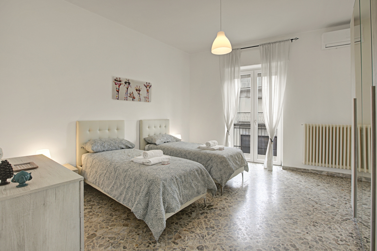 Bedroom 2: A second spacious bedroom furnished with 2 single beds, a wardrobe and French windows out onto a small balcony.