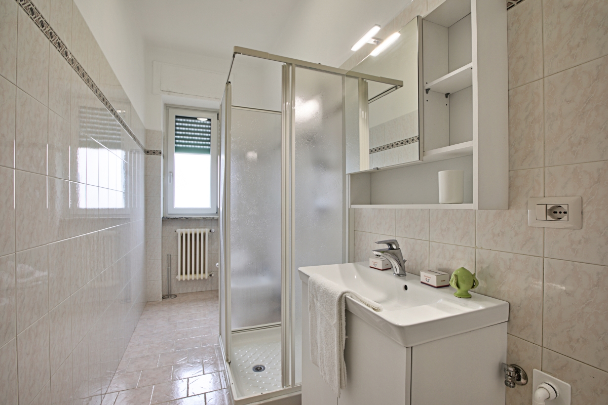 The first-floor apartment, which sleeps 5 people, has been recently renovated in a contemporary style. The entrance hall is furnished with two armchairs and makes an ideal reading spot. The main sitting room has a large sofa, flat-screen TV and laptop-friendly workspace, for guests who need to stay in touch with work. Double glass doors lead to a small balcony overlooking the quiet street.