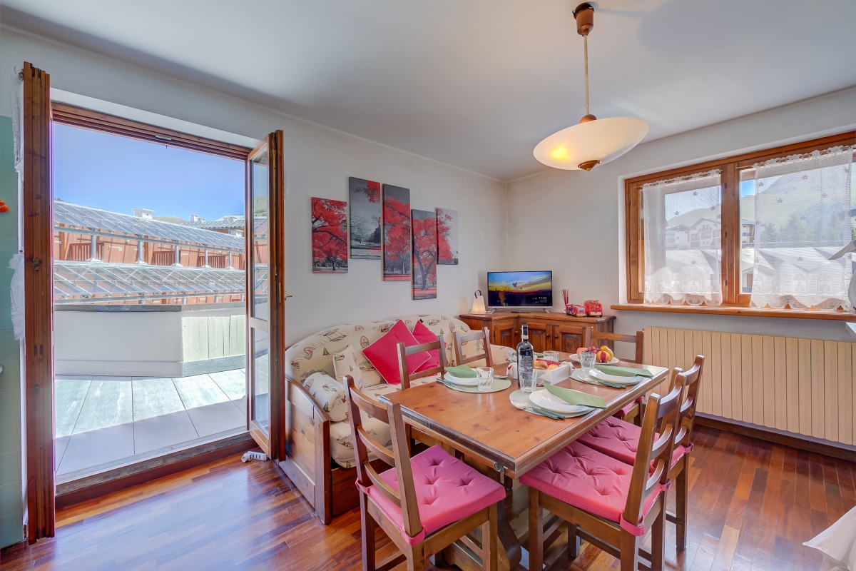 On the 2nd floor (with lift) of a prestigious complex, the apartment has a cosy open plan living area, with wooden panelling, a comfortable sofa, smart TV and traditional dining table for 4 people. The kitchenette is equipped with an induction hob, dishwasher, microwave, fridge, Nespresso coffee machine and toaster. Glass doors from the kitchen lead out onto a large 60mq terrace with BBQ, parasol and sunbeds, which overlooks the heart of Sestriere and the mountains beyond.