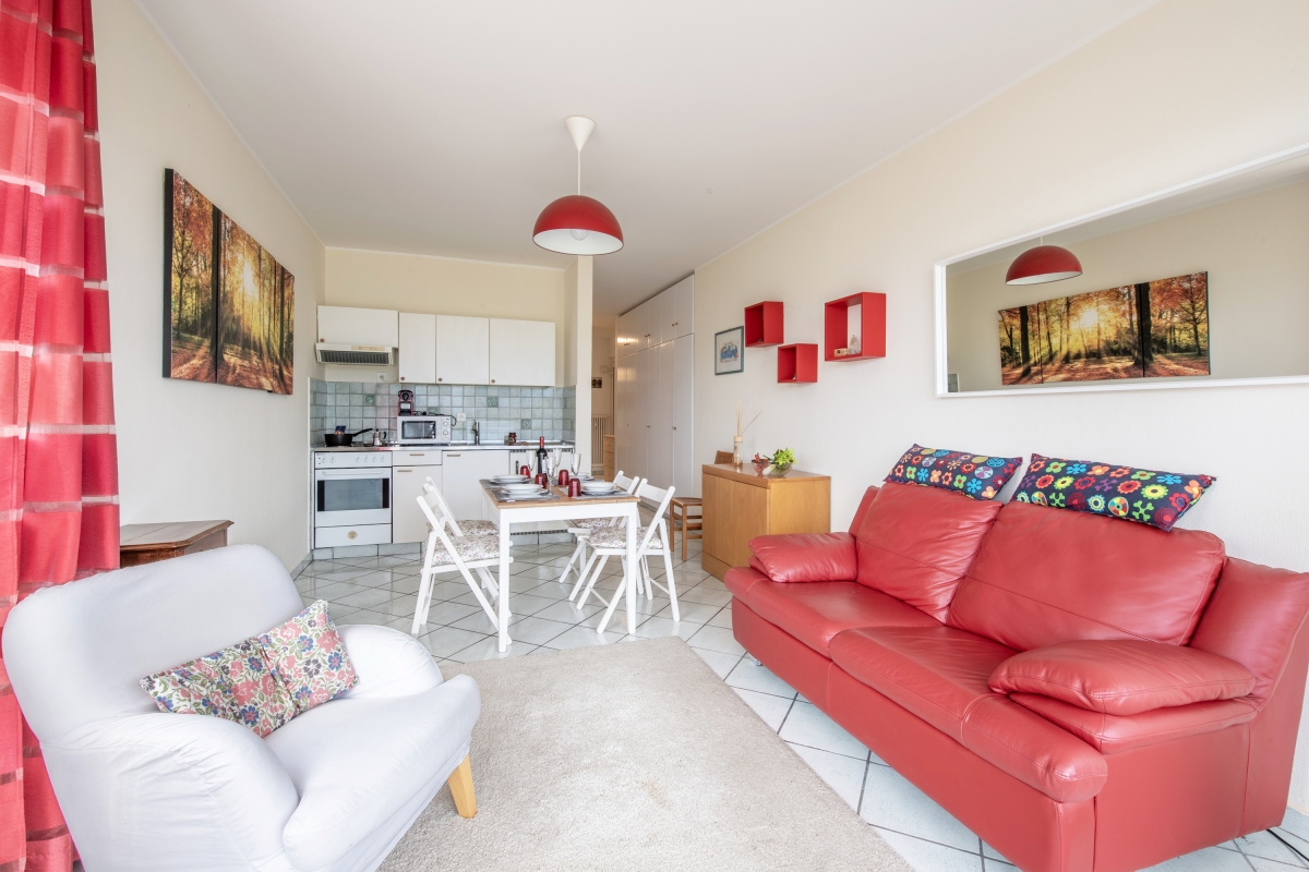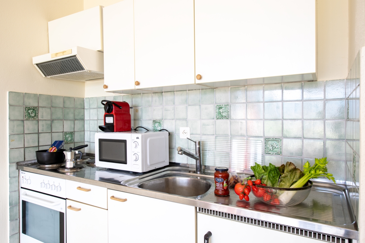 The airy, open-plan living area combines indoor and outdoor life thanks to large glass doors opening onto the private balcony. The balcony is furnished with a table and chair for guests to dine al fresco and really enjoy the scenery. Inside there is a stylish sofa and an armchair. The dining table and chairs lead to the kitchen. The kitchen is well-equipped with a cooker hob, microwave, oven, fridge-freezer and a Nespresso machine.