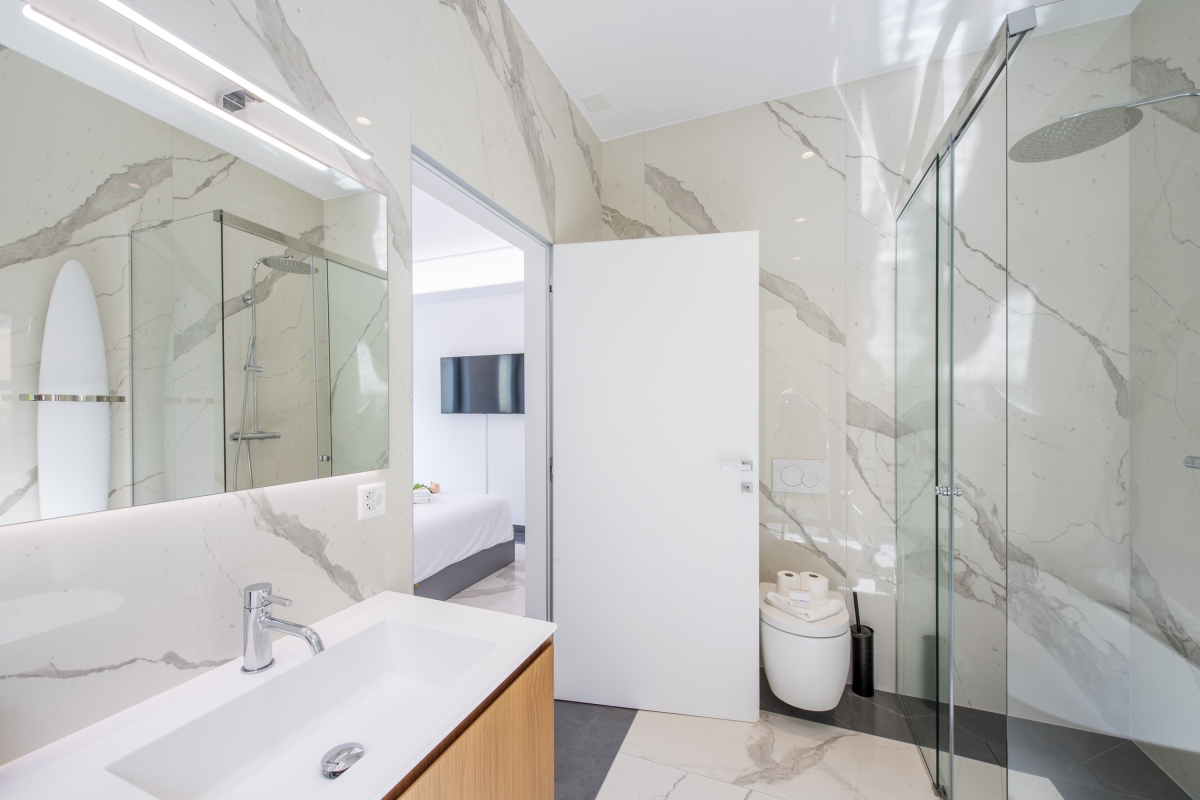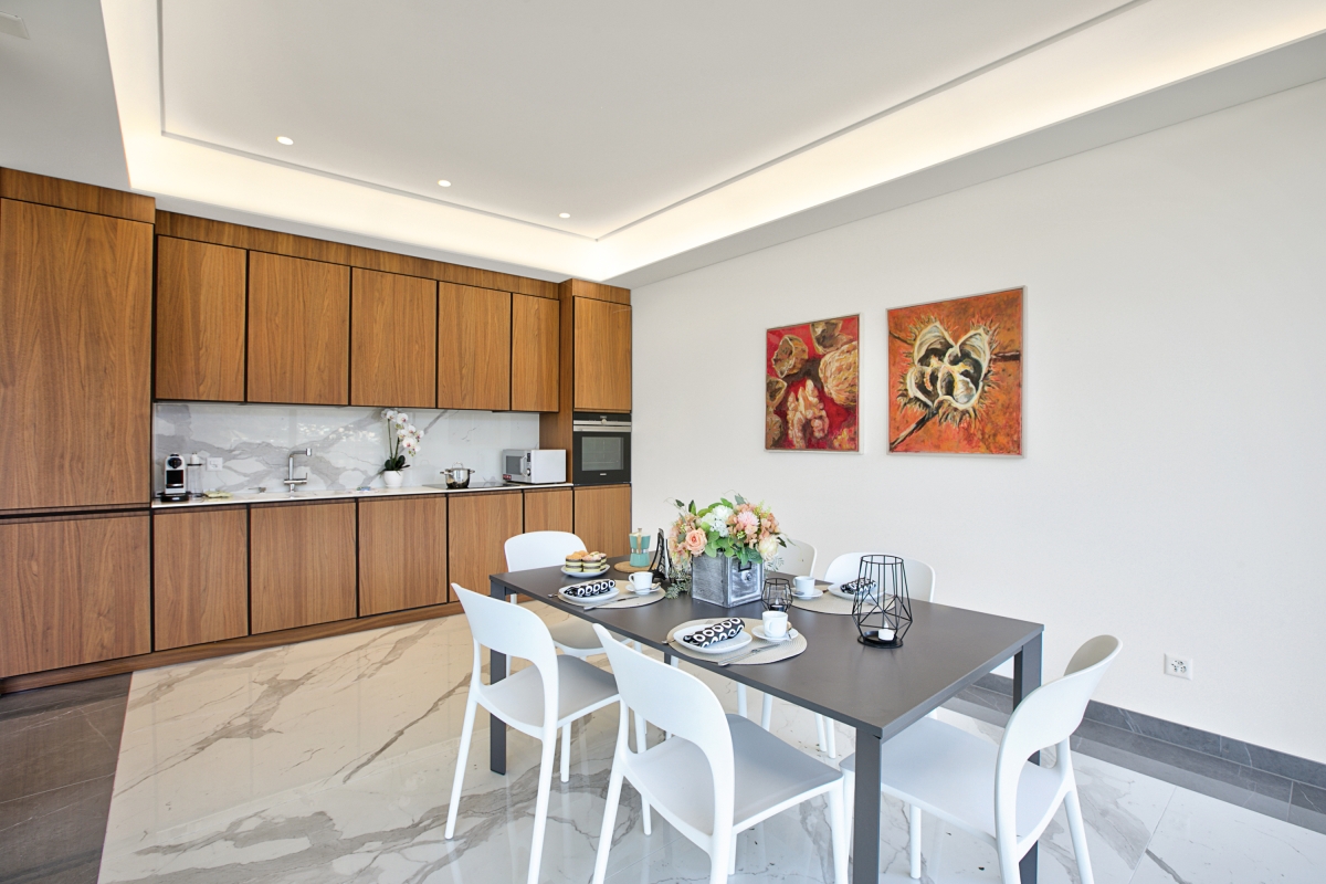 Inside, the balcony retreat has a chic, modern space enlivened by panoramic windows that offer stunning views from every corner; whether it is indoor dining and lounging or the plush living room with Smart TV. Meanwhile, the sophisticated kitchen with a breakfast table offers every essential utility for you to whip up meals and enjoy together. A coffee machine, induction hob, microwave, dishwasher, oven, and fridge are at guests’ disposal here.