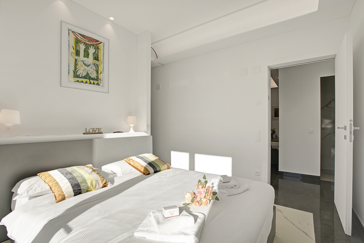 Bedroom 2: A luminous lake-view bedroom with a double bed, ensuite bathroom and a wardrobe.