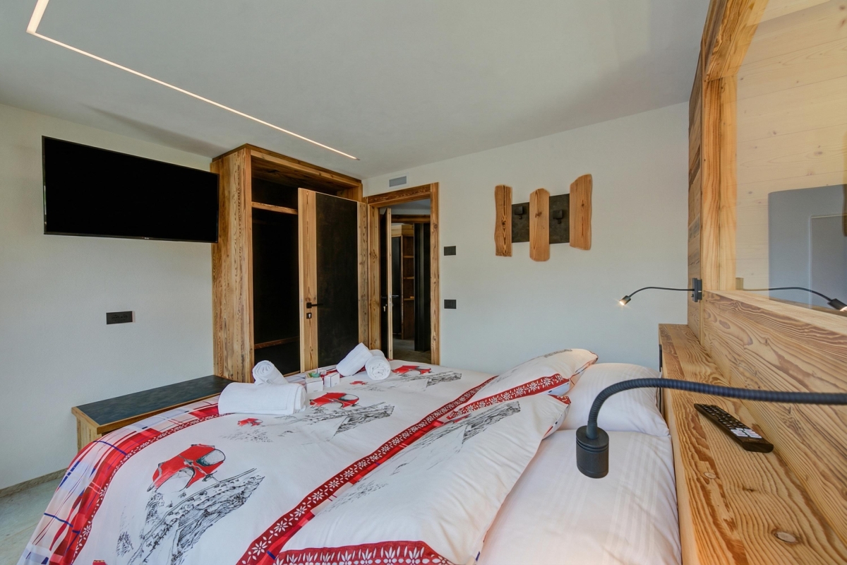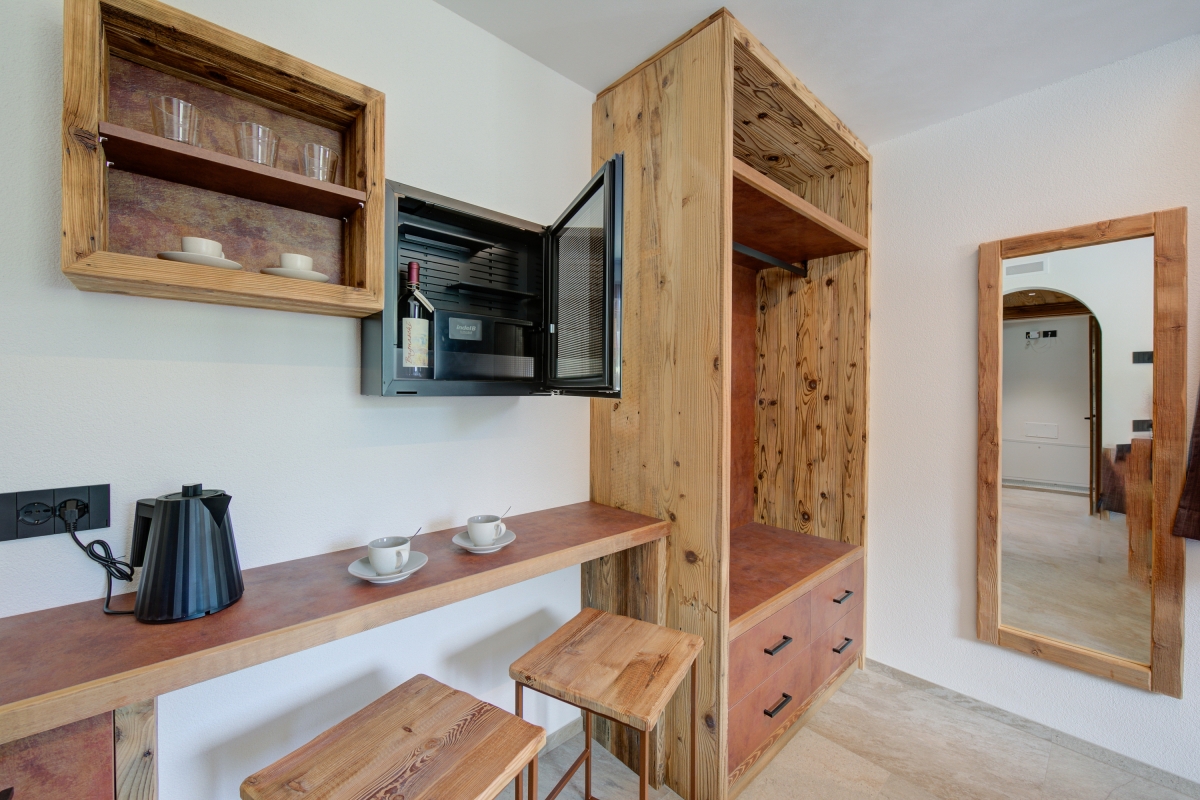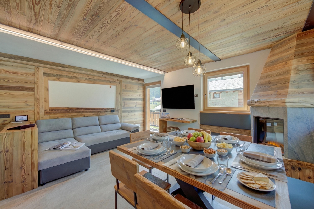 The cosy and warm wooden interiors of the open-plan apartment offer a relaxing living area with ample sofa seating and indoor dining. This area also leads out to the balcony, where you can unwind in the peaceful, sunny and lush location of the chalet with a panoramic view of the Alps. A ski-boot heater and ski storage are also available for a carefree and comfortable ski holiday.