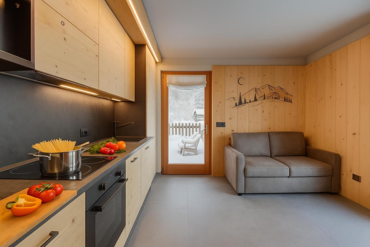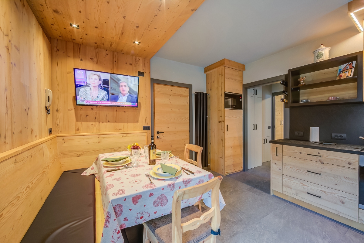 Inside the property is tiled throughout and centres around a cosy open-plan living space that incorporates a small kitchen and dining area. The ideal place for unwinding after a day on the slopes, the space is furnished with a sofa bed, a dining table and a Smart flatscreen satellite TV. The kitchen is fitted with a coffee machine, an induction hob, an oven, a microwave, a dishwasher and a fridge freezer. There's even a skiboot heater to keep your gear warm and dry.