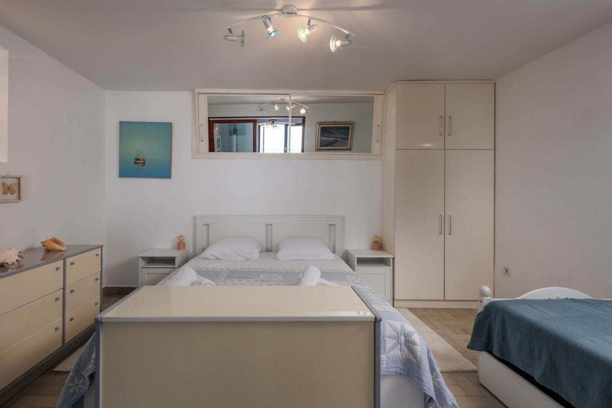 The apartment, which sleeps 5 people, combines indoor and outdoor living with a large balcony overlooking the sparkling Adriatic Sea. The airy kitchen/dining area has a dining table for 5 and an open-plan kitchen. The kitchen is equipped with a cooker hob, oven, dishwasher, large fridge, freezer and Nespresso coffee machine. Double French windows lead directly onto the balcony with wonderful sea views.