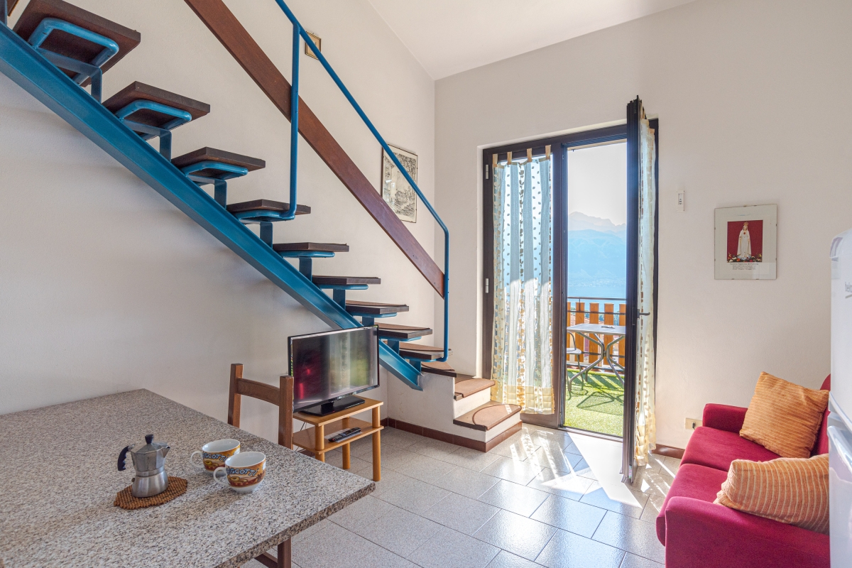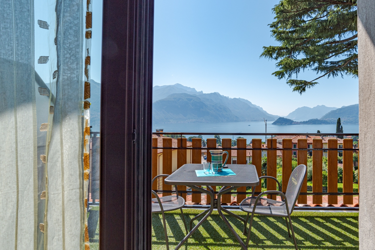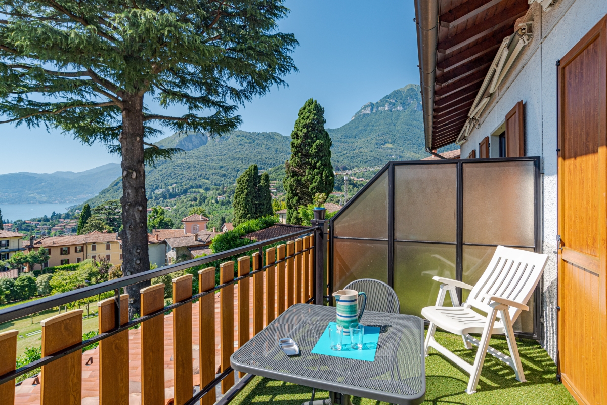 The apartment, which sleeps 4 people, is decorated in a contemporary style, with a sunny, open-plan living area, furnished with a sofa and flat-screen TV. The dining table with 4 chairs is next to the kitchen. The kitchen is well-equipped with an induction hob, microwave, fridge, freezer and coffee machine. Large glass doors lead from the living room to a private balcony with a panoramic view over Lake Como. There is a table and chairs, so that guests can relax and enjoy the scenery with a cup of coffee or an aperitif.