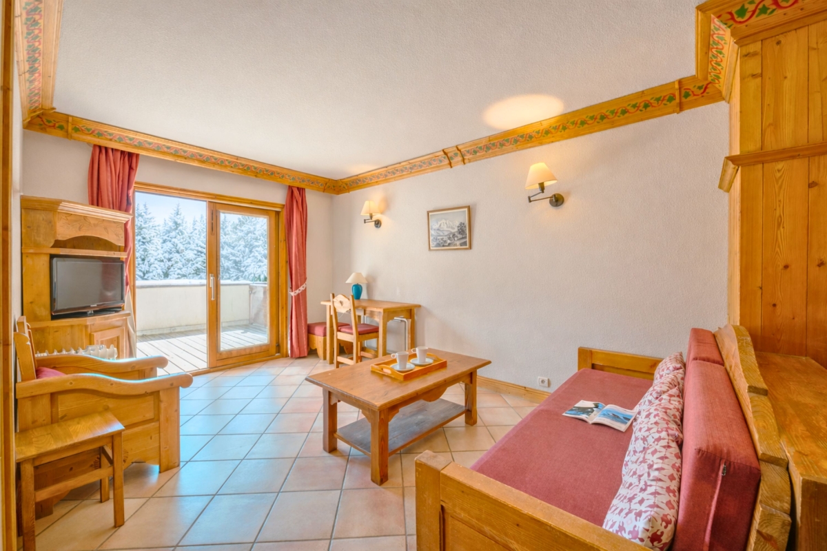 Located just a short walk from the ski lift, this charming Savoyard holiday apartment for 5 provides the perfect blend of Alpine living and modern facilities. Outside, with stunning mountain views, guests can unwind on the cosy, sun-dappled terrace surrounded by peace and greenery. Meanwhile, inside the welcoming and modern living room provides the perfect opportunity to relax, featuring an open-plan layout with a flat-screen HDTV, indoor dining, and a fully-equipped kitchen. Every essential utility, including a dishwasher, oven, microwave, drip coffee machine, fridge, and toaster is at your disposal.