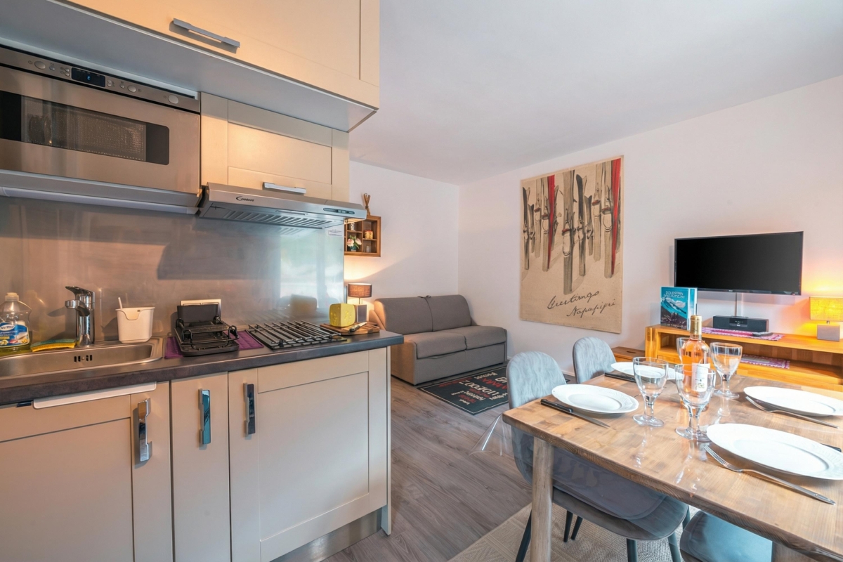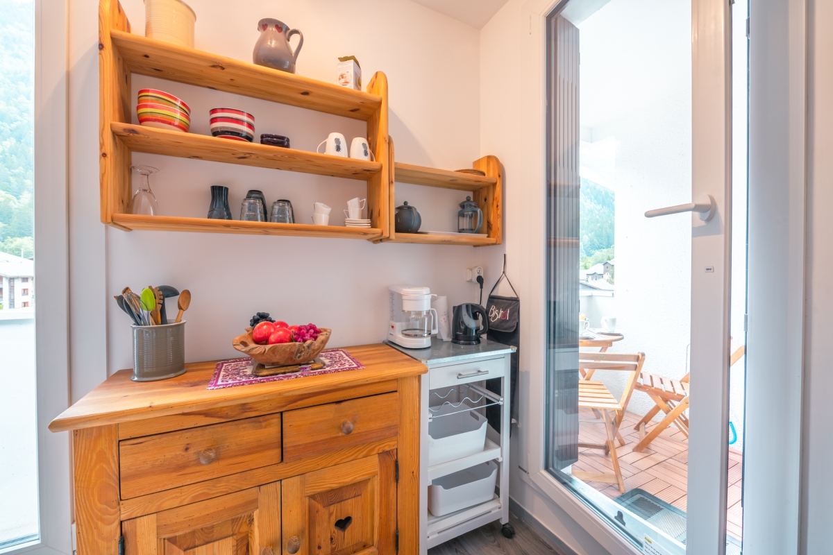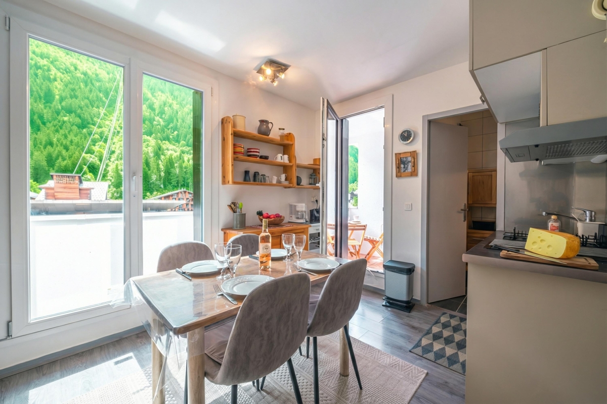 Located on the third floor, close to the Aiguille du Midi ski lift, this mountain-view getaway is perfect for an effortless ski holiday in Chamonix. The modern yet cosy apartment features a cosy living with a flat-screen TV and a private balcony, where you can relax after a busy day outdoors whilst enjoying panoramic alpine views. A well-equipped kitchenette with an oven, induction hob, microwave, fridge, toaster, and coffee machine is available for a carefree holiday.